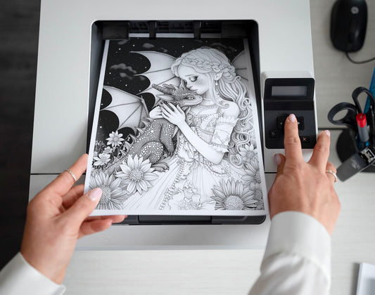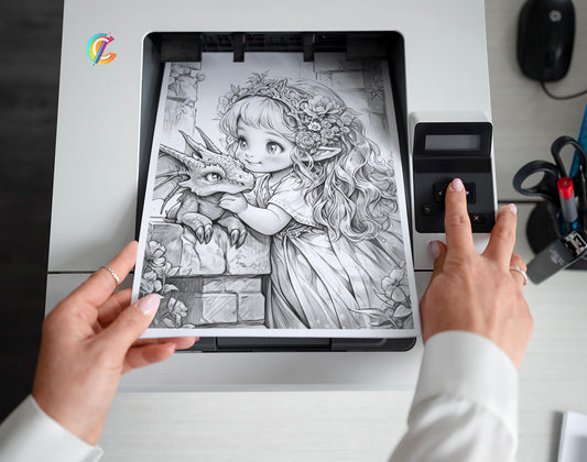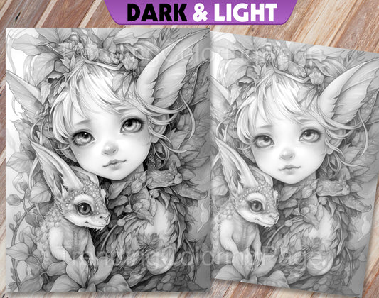 50 Fairy And Dragon 3 Grayscale Coloring Pages - Instant Download - Printable PDF Dark/Light