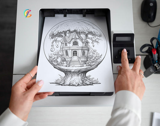 25 Fairy House In Magic Ball Grayscale Coloring Pages - Instant Download - Printable PDF Dark/Light