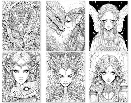 25 Fairies & Dragons Grayscale Coloring Pages - Instant Download - Printable PDF