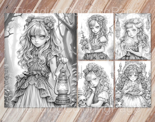 30 Little Gothic Princess Grayscale Coloring Pages - Instant Download - Printable PDF Dark/Light