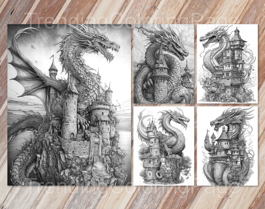 25 Dragon Castle Grayscale Coloring Pages - Instant Download - Printable PDF Dark/Light