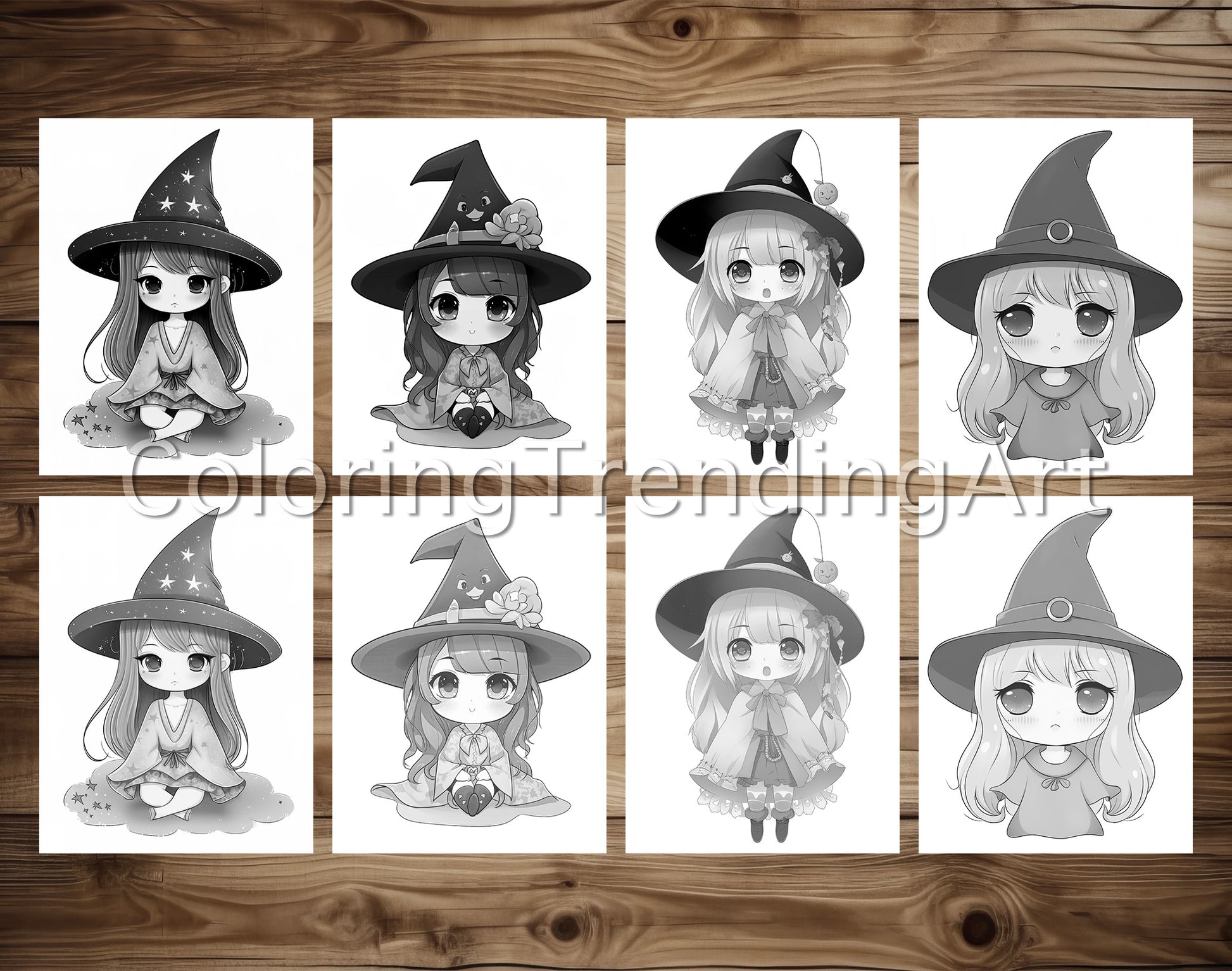 - 25 hochwertige Chibi süße Hexe Graustufen Ausmalbilder.