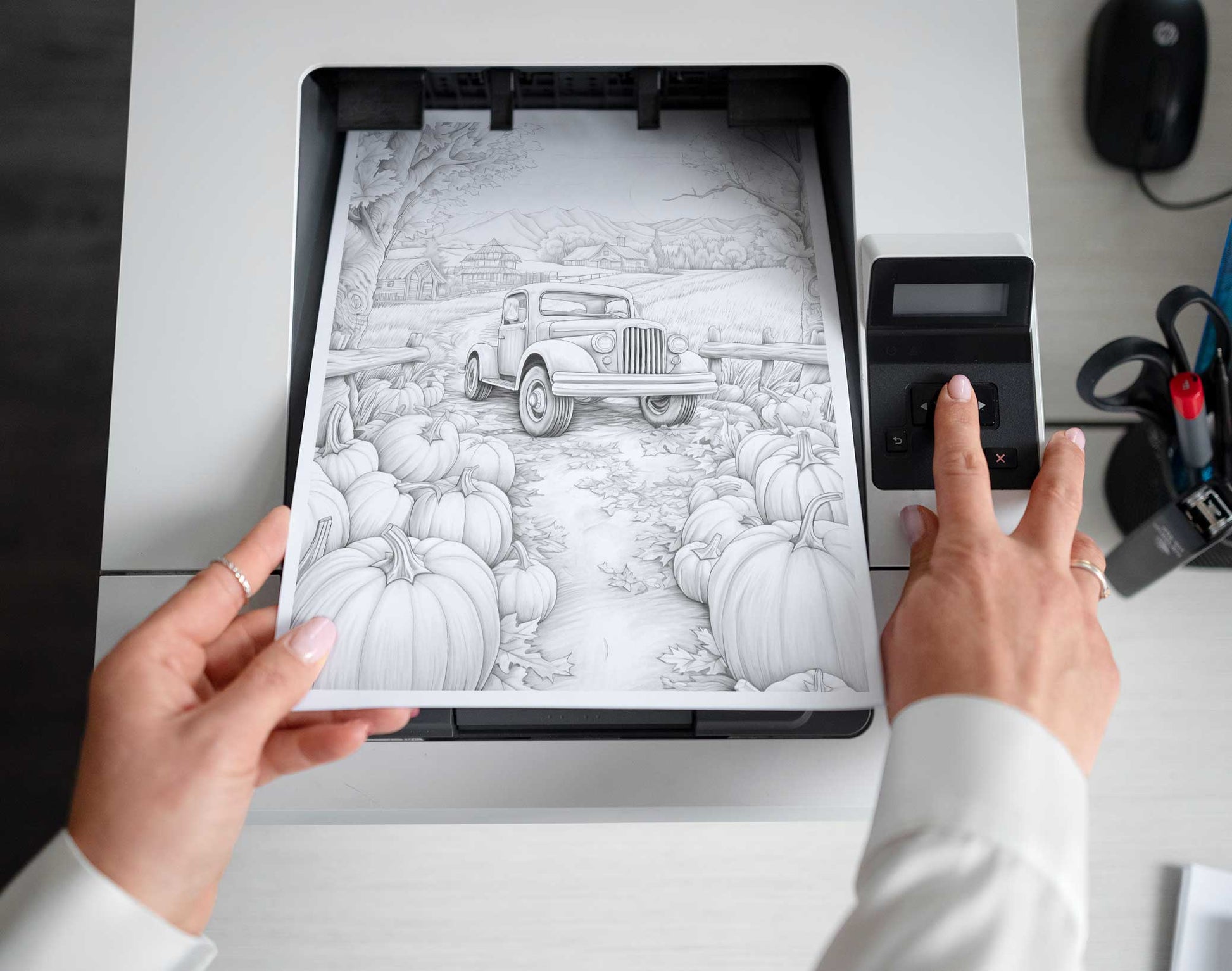 - 25 Wunderschön gestaltete Ausmalseiten im Graustufen-Design mit Herbststimmung.