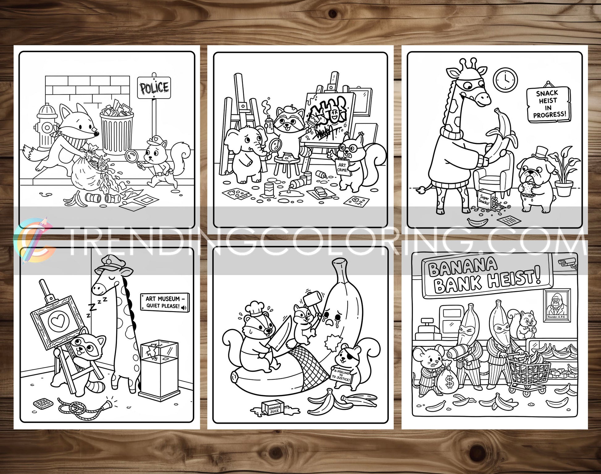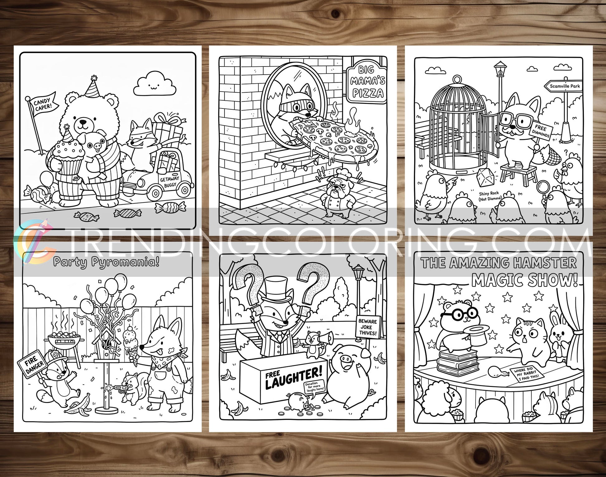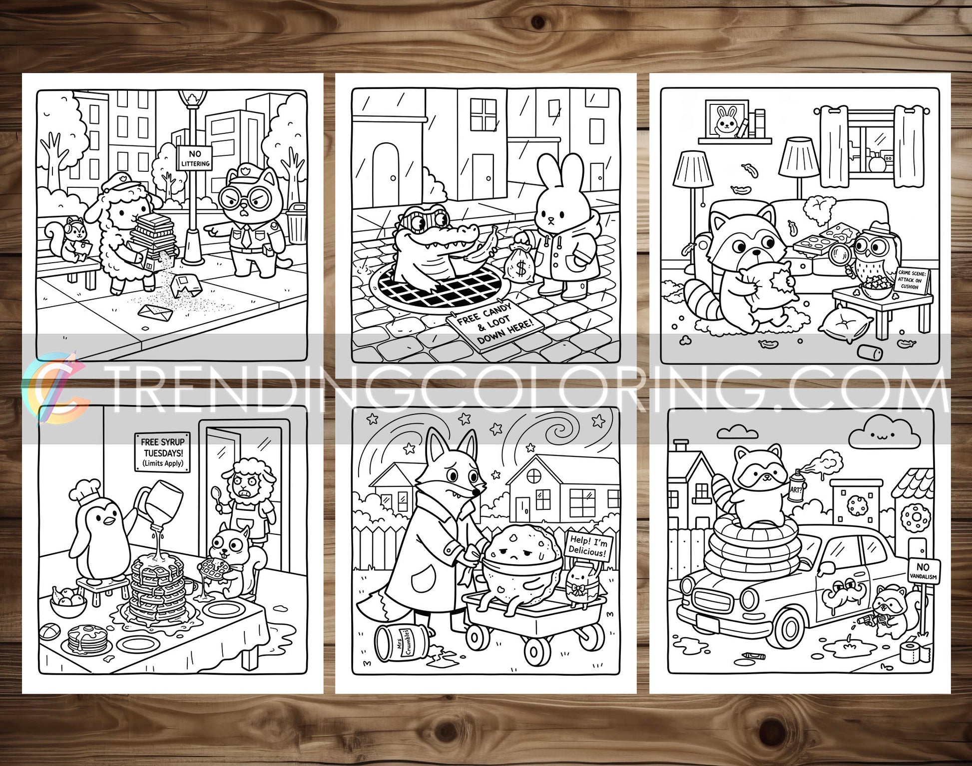 This hilarious PDF features 45 unique 8.5x8.5 inch illustrations, blending silly crime scenes with adorable characters and cozy cartoon settings. Perfect for fans of cute and simple coloring pages who love a funny twist.