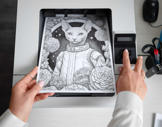 50 Cat In Space Grayscale Coloring Pages - Instant Download - Printable PDF Dark/Light