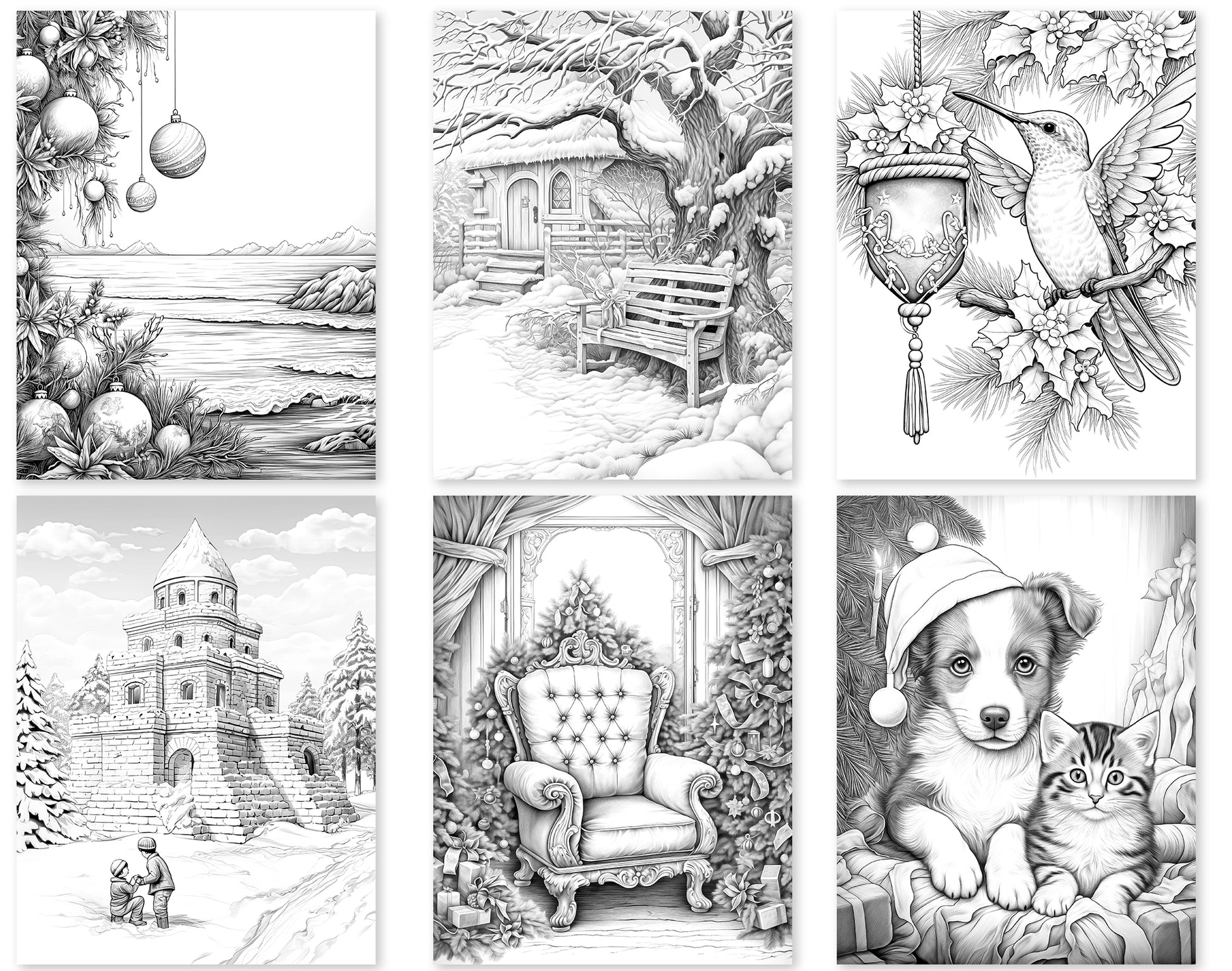 Each page in this collection features a beautifully detailed grayscale scene, capturing the essence of the holiday season in a way that soothes the soul. From serene winter landscapes to gentle holiday motifs, these pages offer a quiet retreat from the festive hustle and bustle. The grayscale shading guides your coloring, allowing for the creation of depth, contrast, and a realistic feel in your artwork. Whether you're a seasoned artist or finding a moment of peace in a busy schedule, these pages are your canvas for a tranquil holiday journey.
