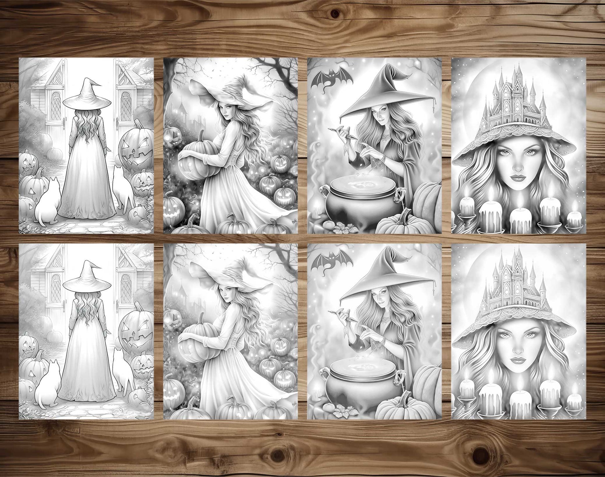 25 Halloween Witches Grayscale Coloring Pages - Halloween Coloring - Instant Download - Printable PDF Dark/Light