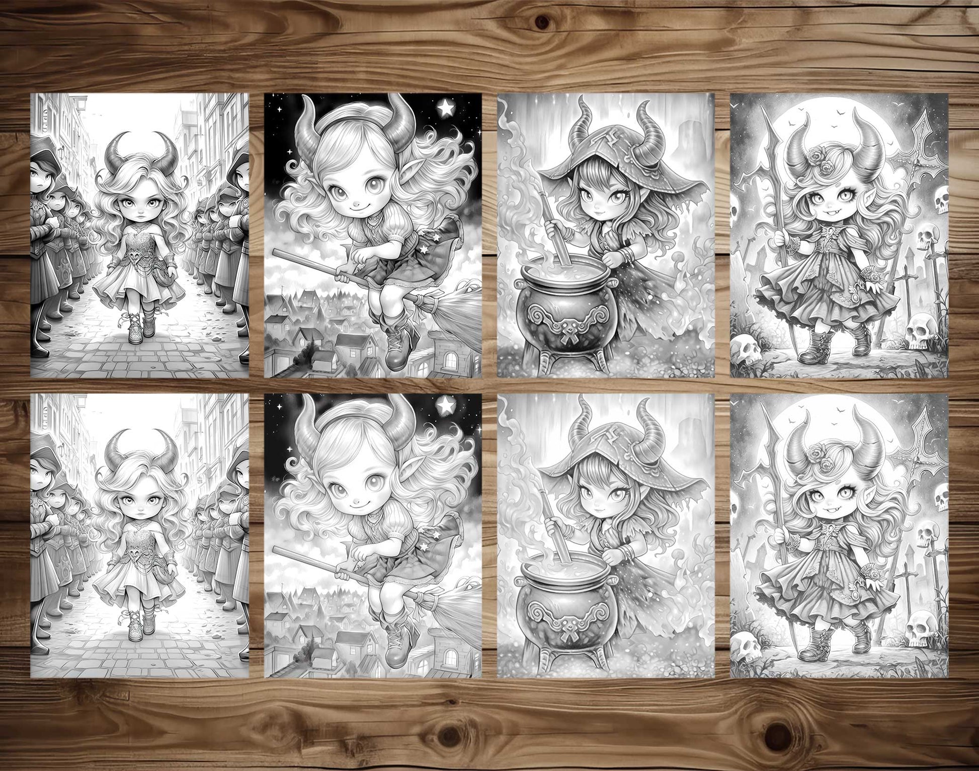 25 Little Devil Girls Grayscale Coloring Pages - Halloween Coloring - Instant Download - Printable PDF Dark/Light
