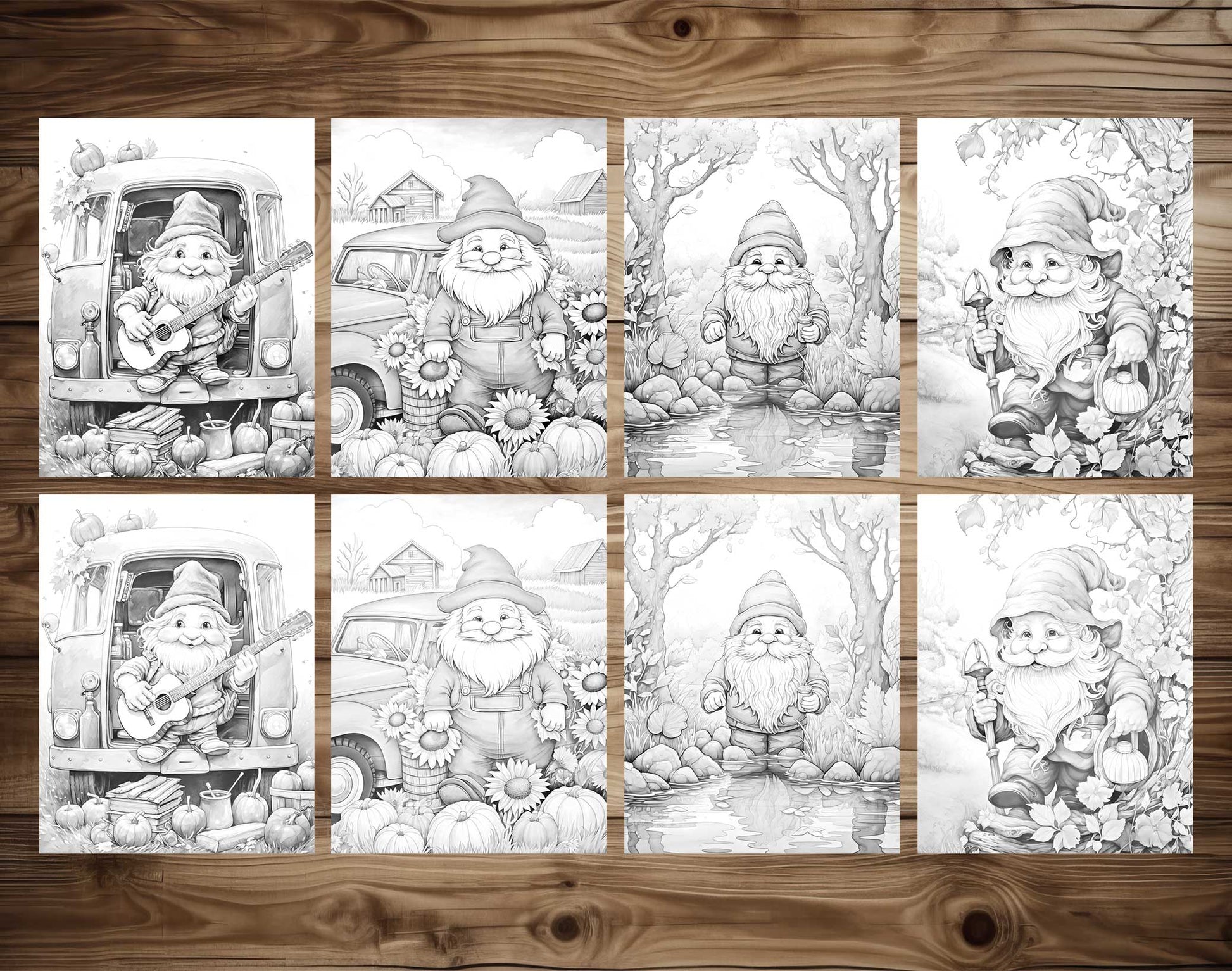 50 Autumn Gnome Grayscale Coloring Pages - Instant Download - Printable PDF Dark/Light