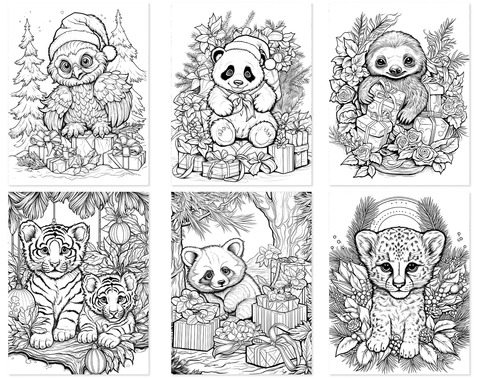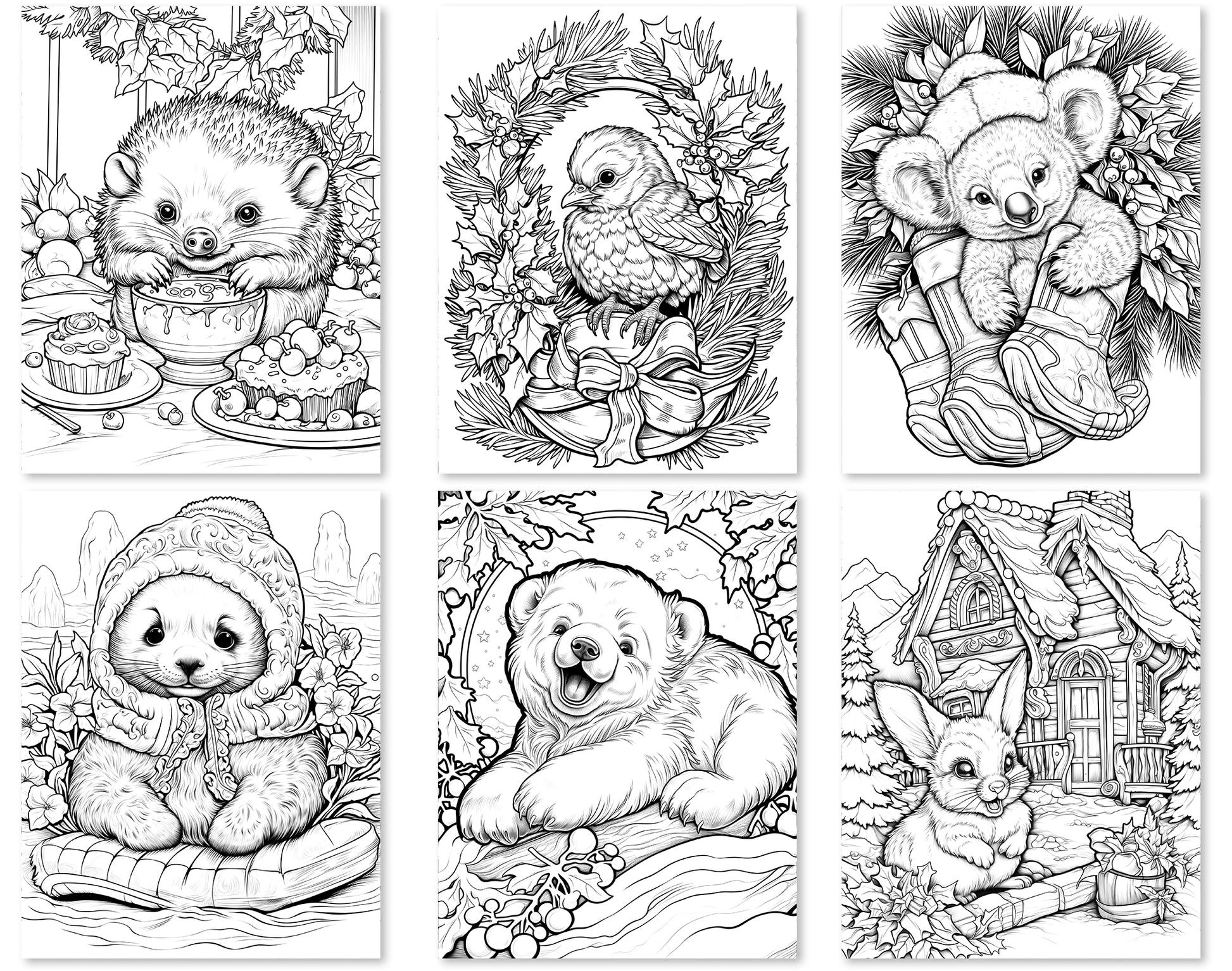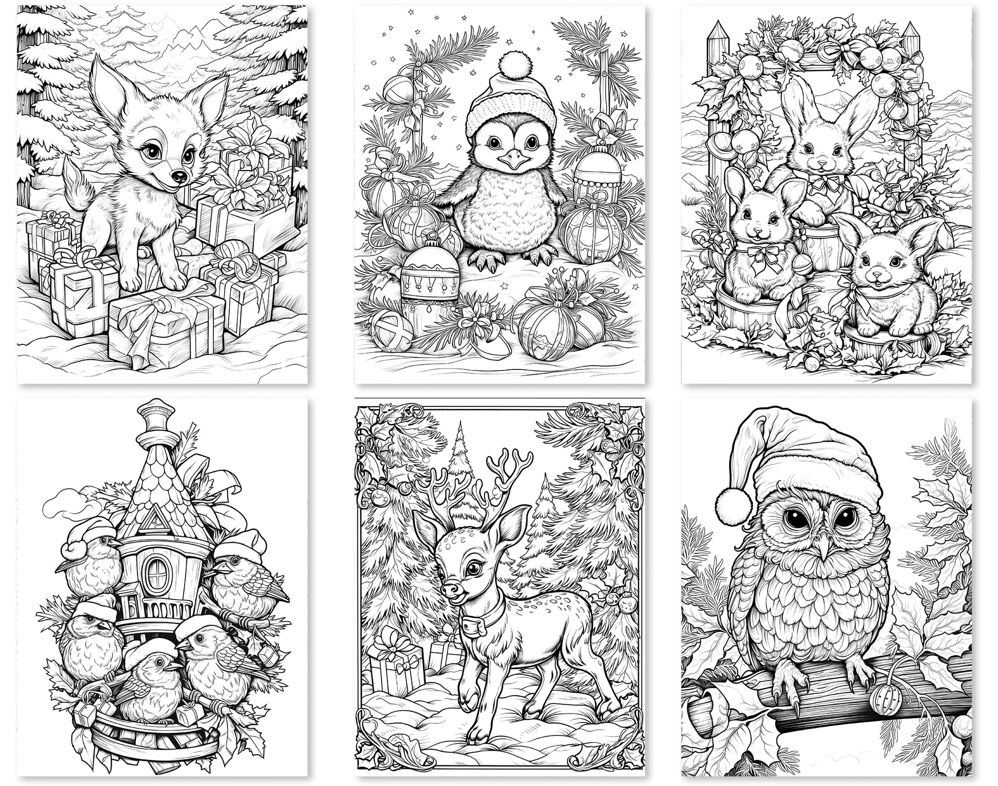 Each page in this collection features a unique and charming scene, starring an array of critters engaging in various holiday activities. From playful penguins decorating a Christmas tree to cozy rabbits wrapped in winter scarves, these pages are filled with heartwarming scenarios that capture the essence of the season. The variety of designs ensures that colorists of all ages and skill levels will find joy and relaxation in bringing these scenes to life.