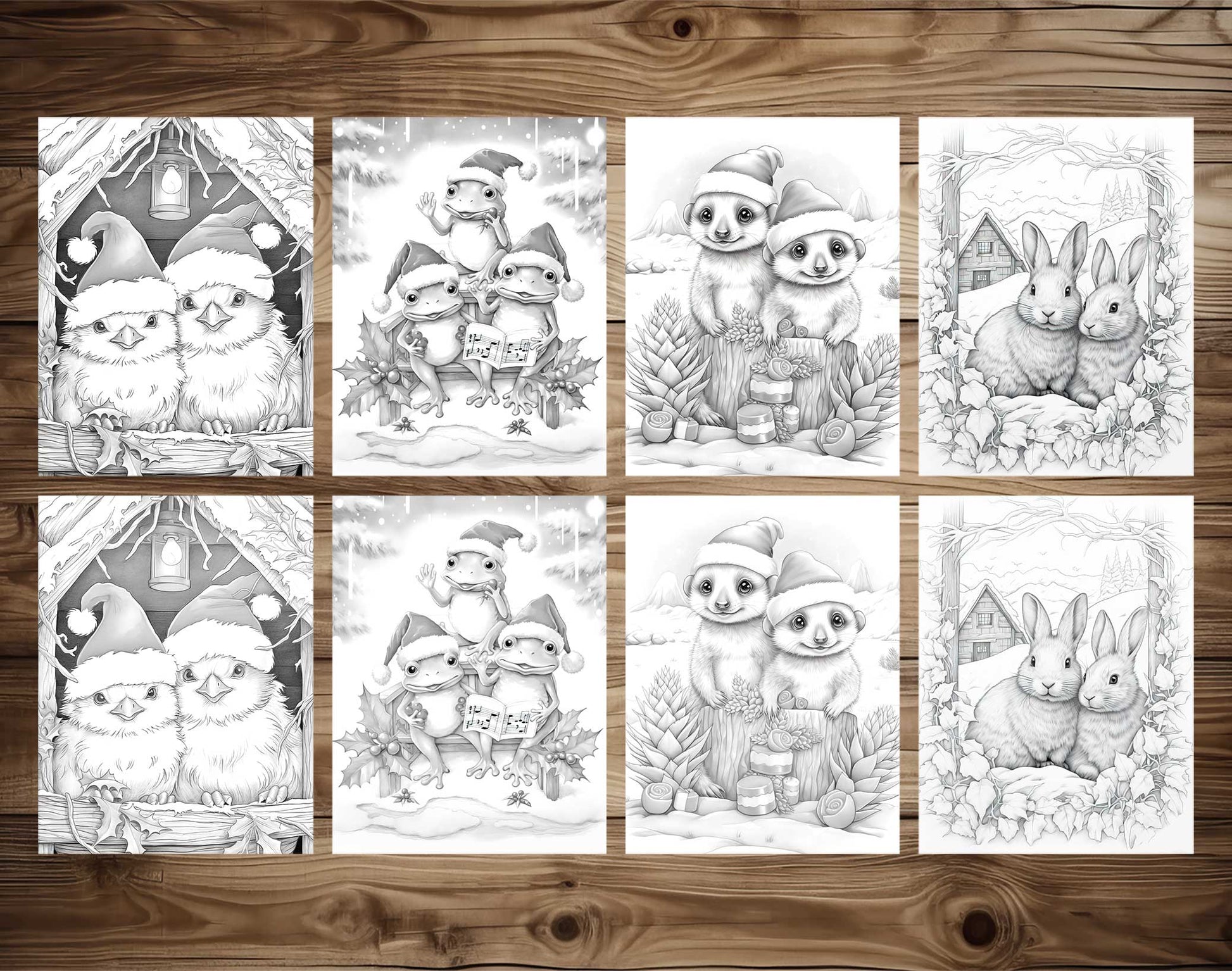 Delight in the festive charm of the holiday season with our adorable collection of 50 Christmas Critters Grayscale Coloring Pages. This heartwarming set brings the playful antics of Christmas animals to life, offering a delightful canvas for your coloring adventure.