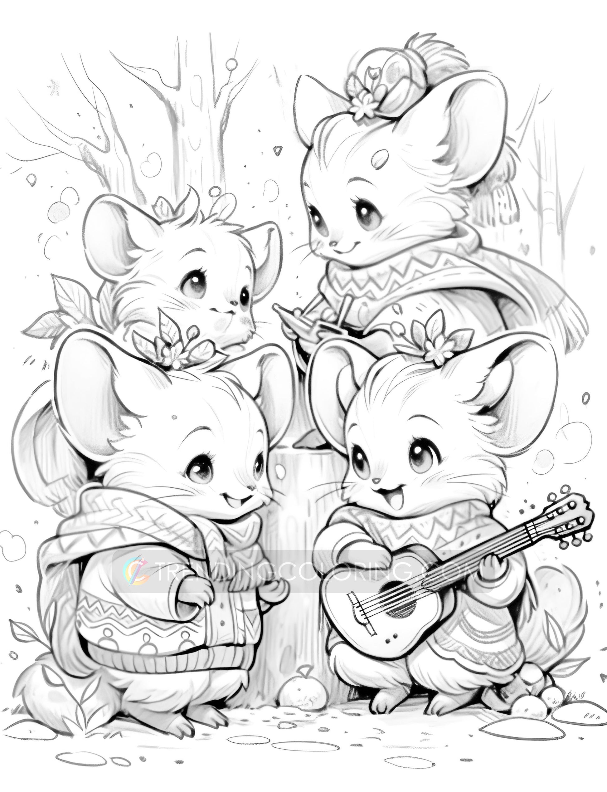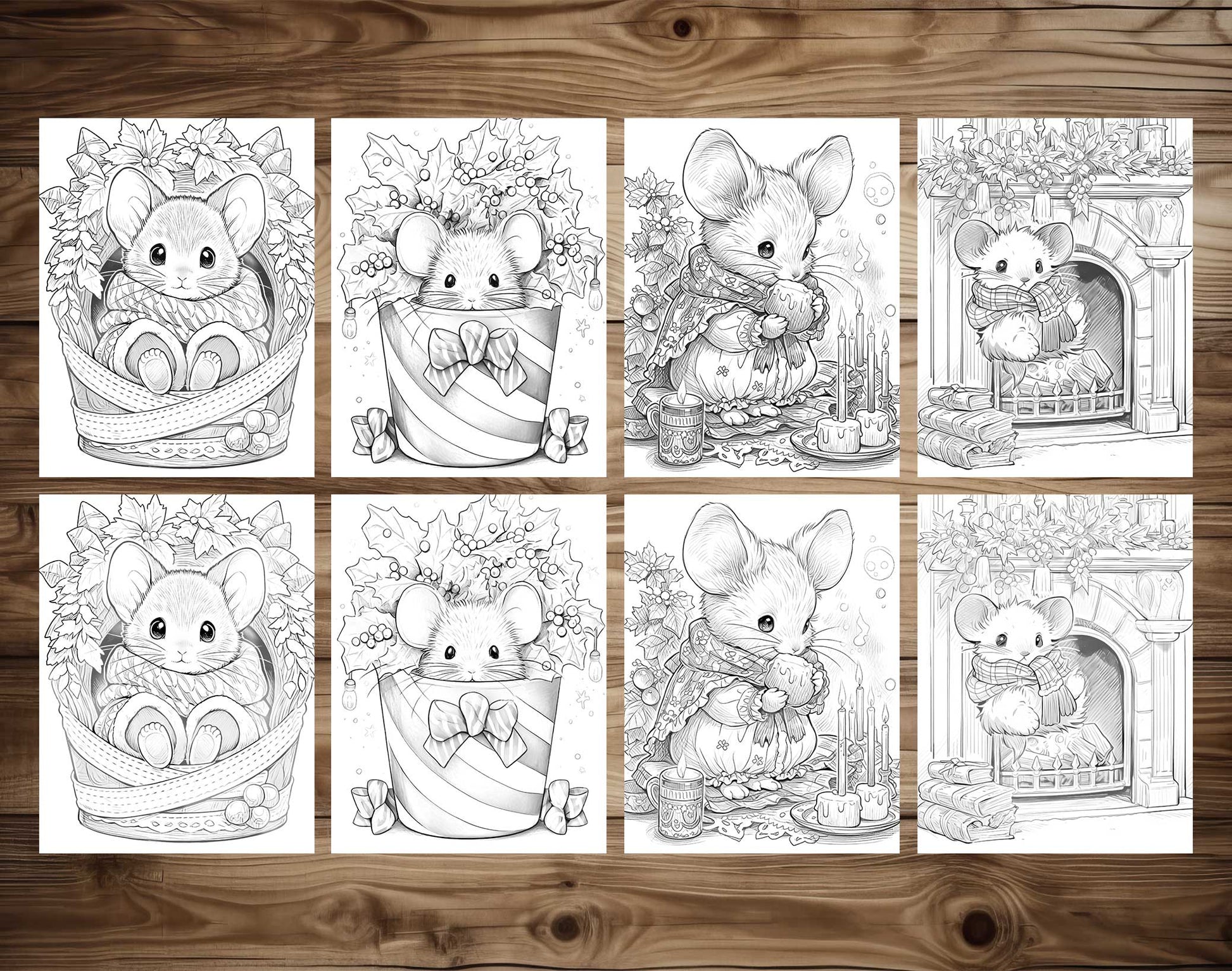 Each grayscale page is a canvas for creativity, featuring these cute critters engaging in classic Christmas activities. From stringing lights and wrapping gifts to sipping hot cocoa and singing carols, these little mice embody the joy and hustle of the holiday season. The grayscale shading guides your coloring, allowing you to bring warmth and life to each scene with your choice of merry hues.
