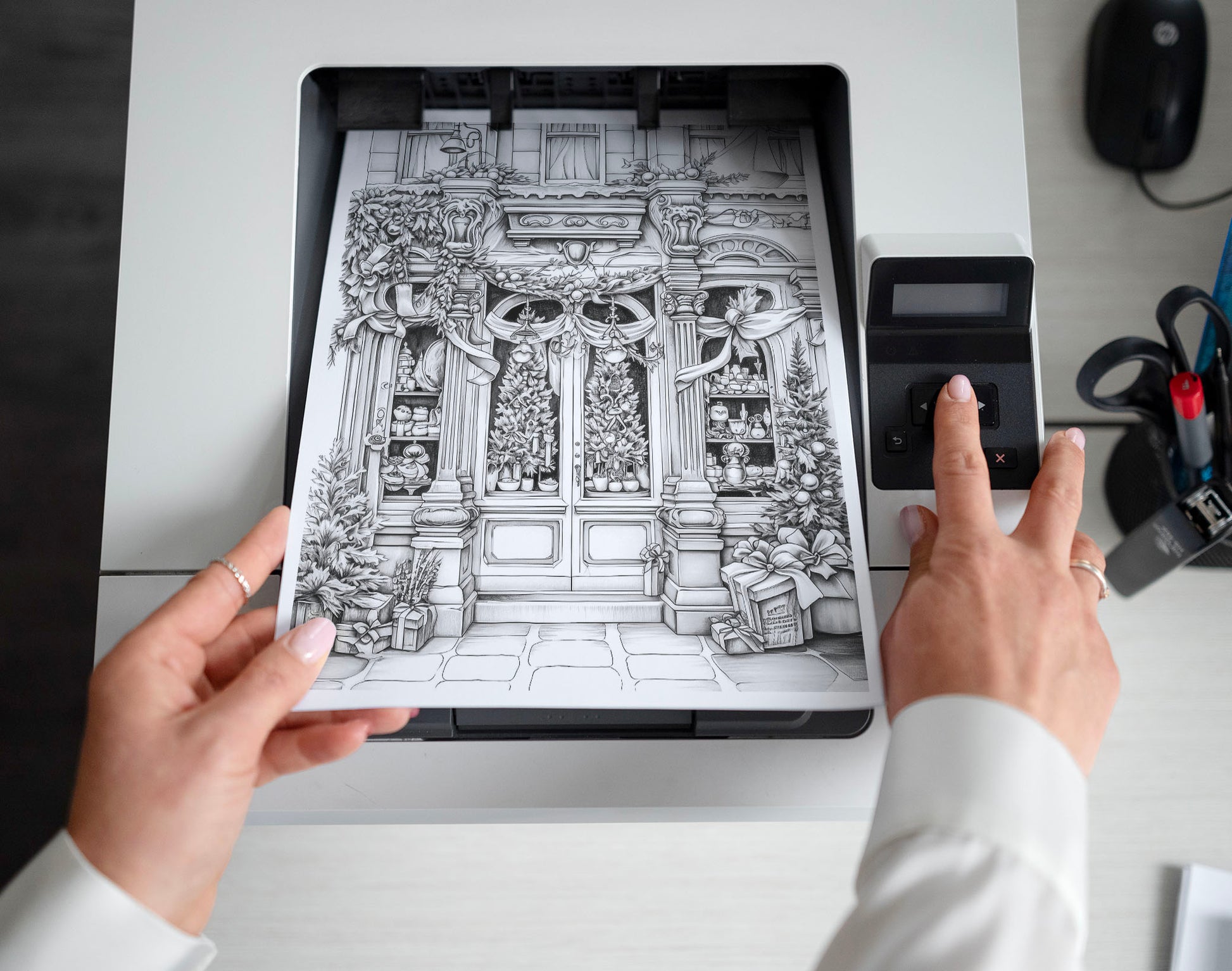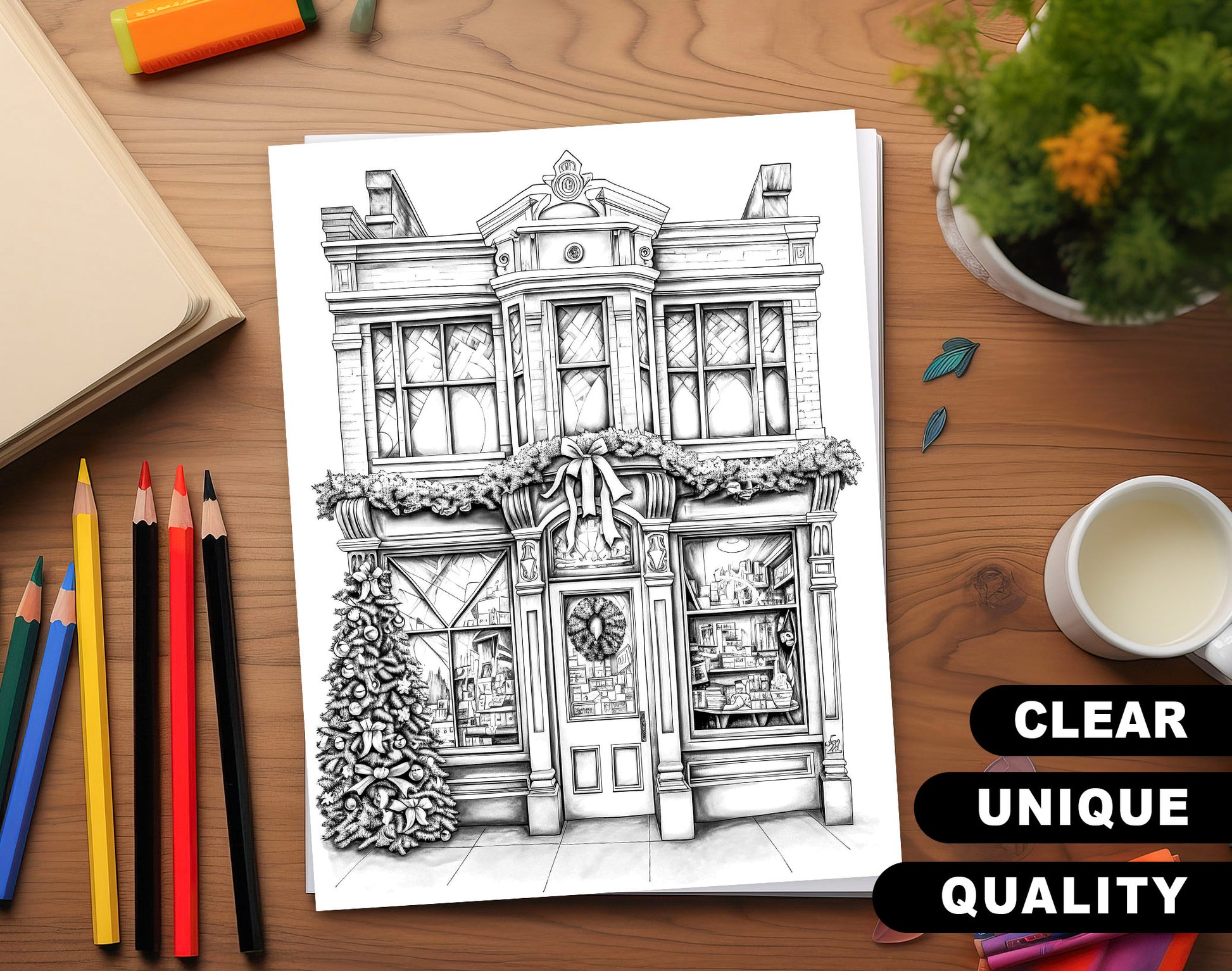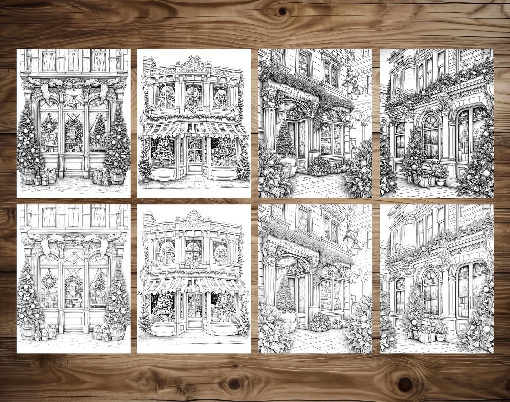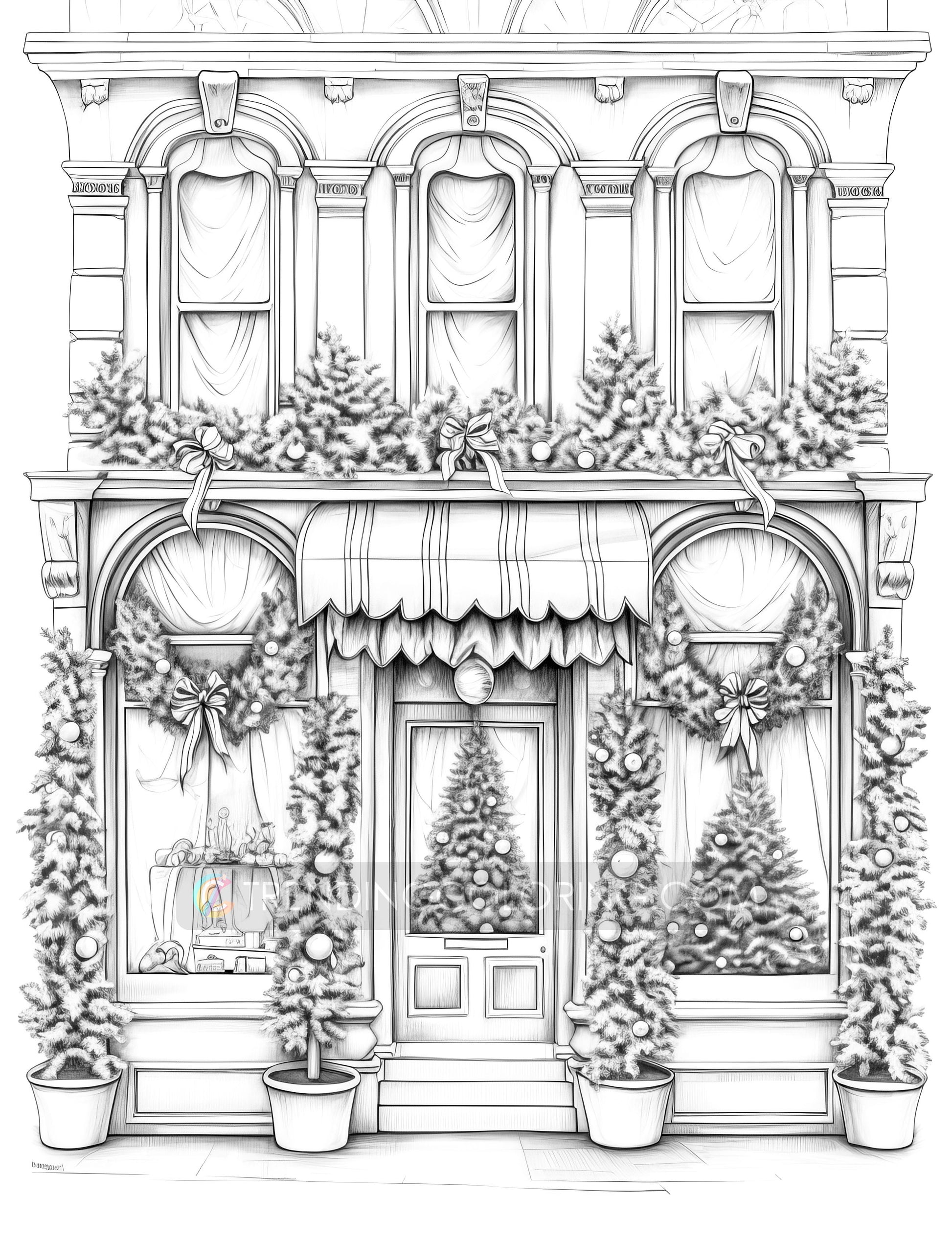50 Christmas Storefront Grayscale Coloring Pages - Instant Download - Printable PDF Dark/Light