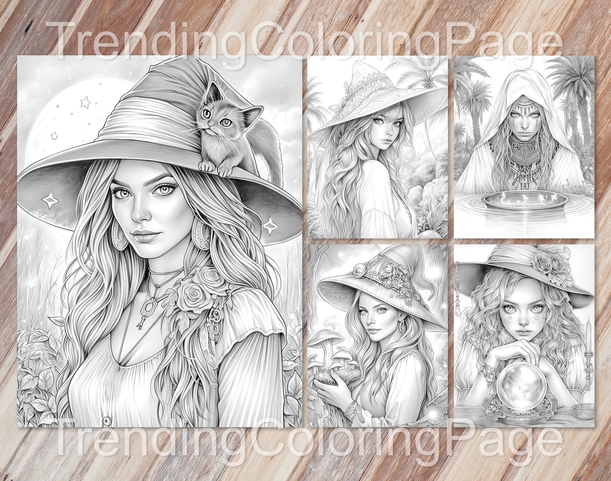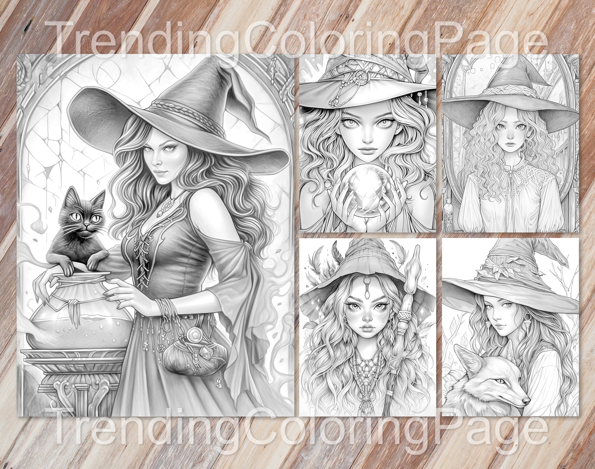 70 Beauty Witches Grayscale Coloring Pages - Instant Download - Printable PDF