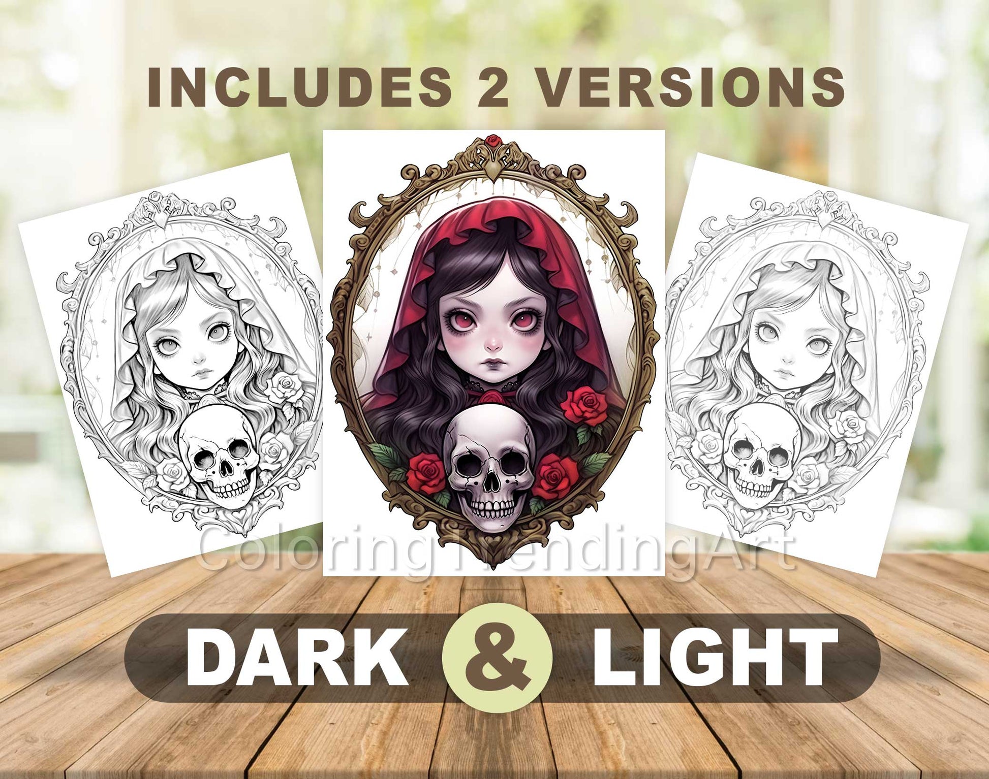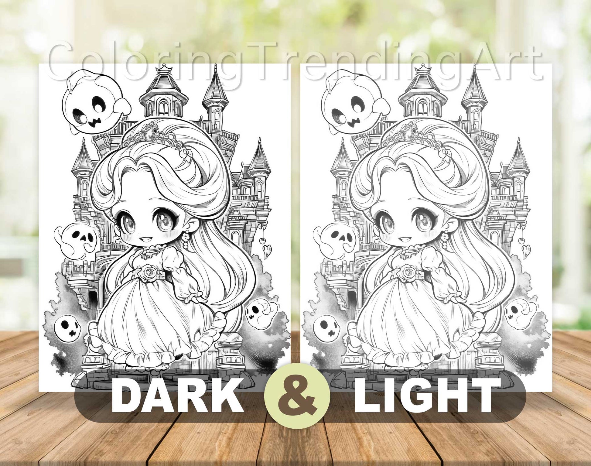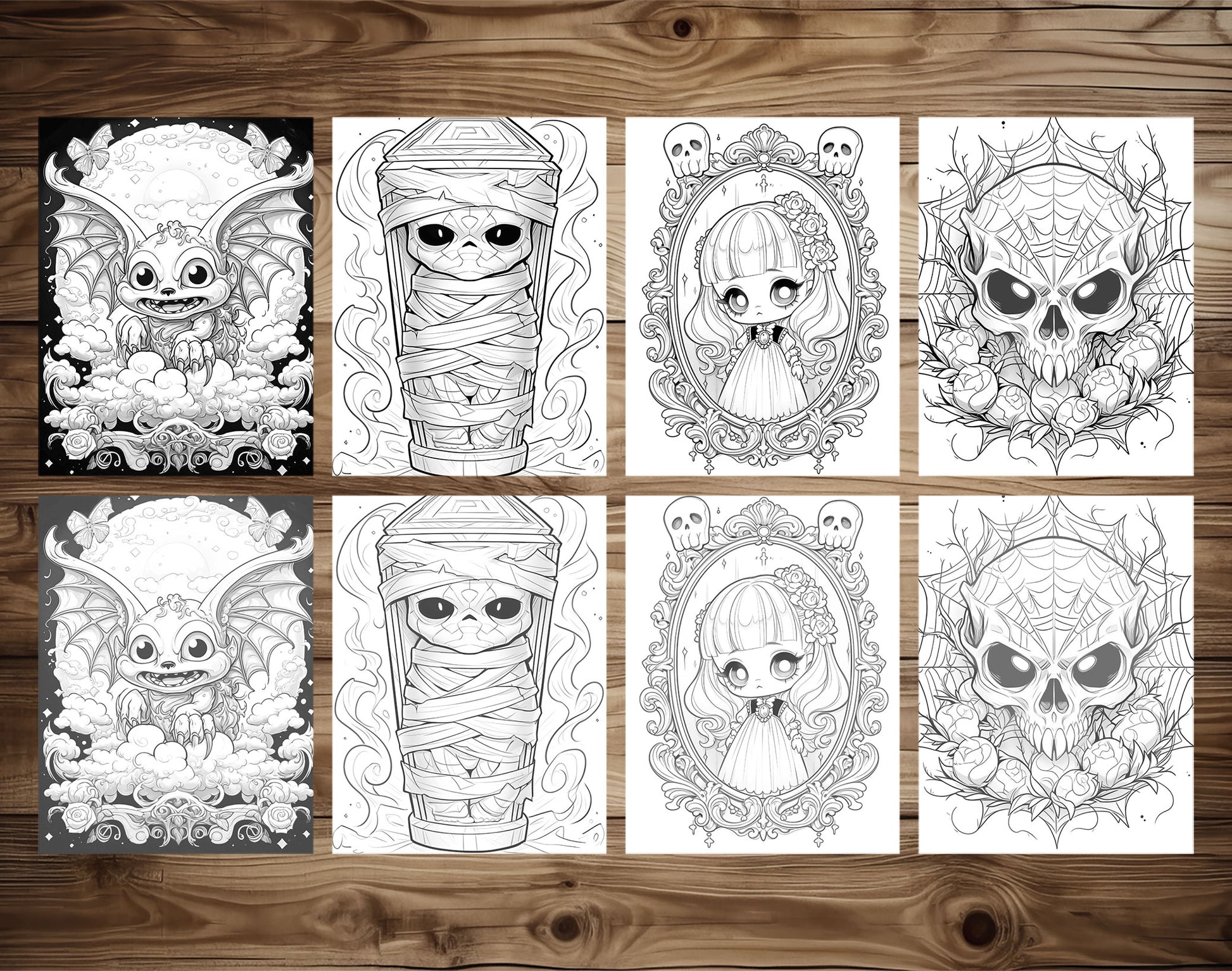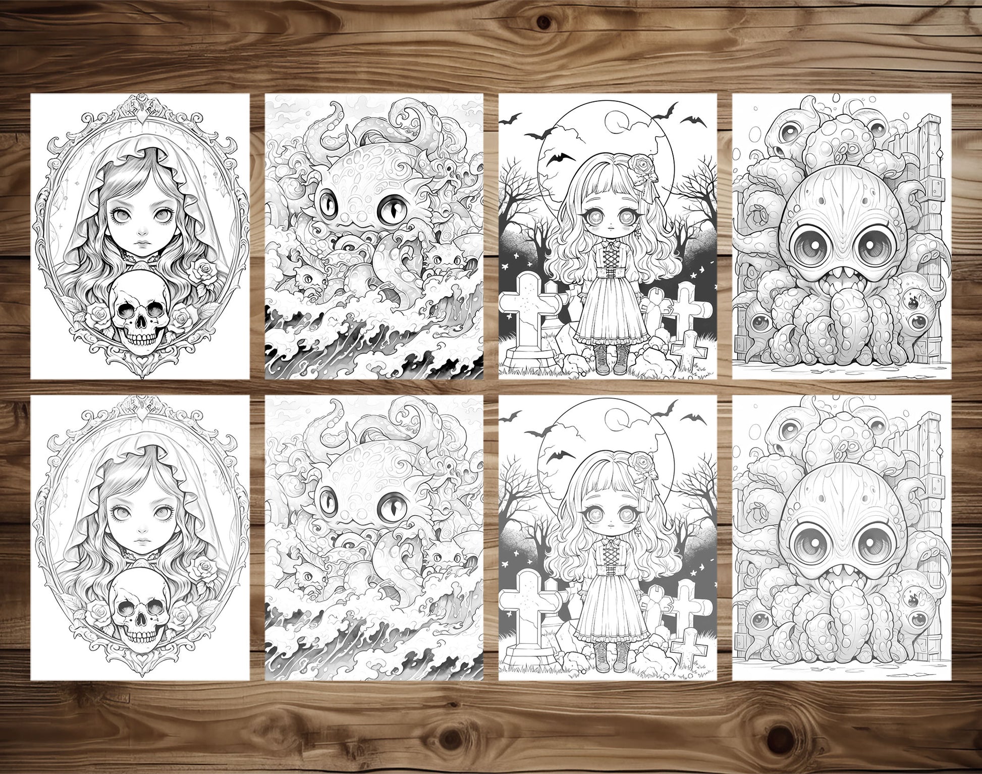 25 Creepy Kawaii Grayscale Coloring Pages - Halloween Coloring - Instant Download - Printable PDF Dark/Light