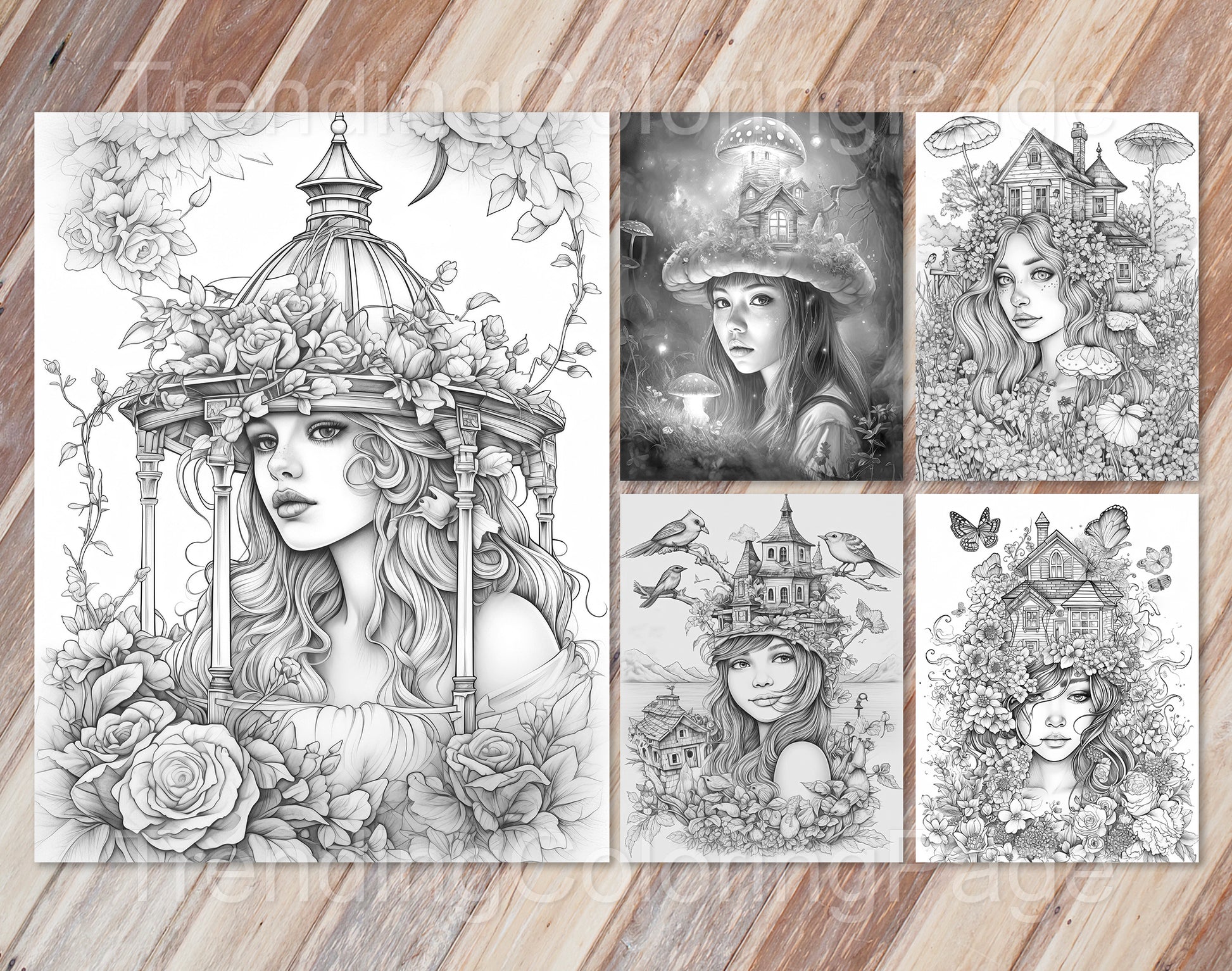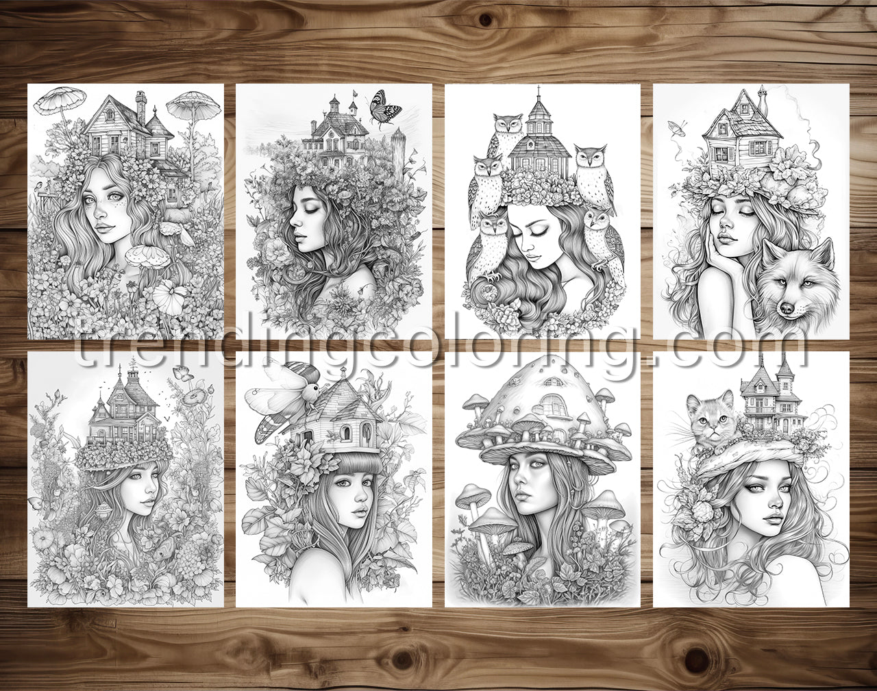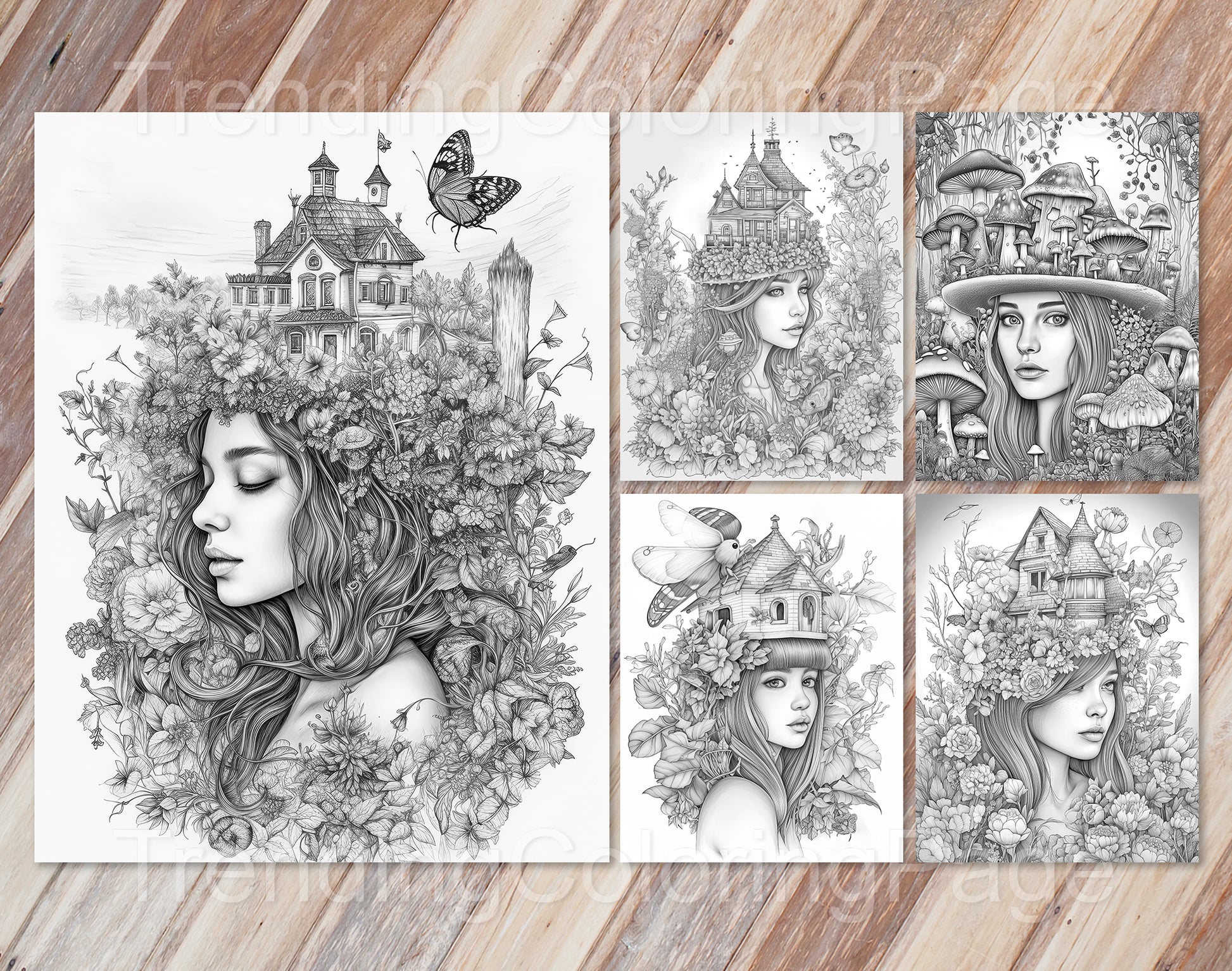 As you color, you'll be immersed in scenes of fairy queens and mystical beings, each crowned with flowers, leaves, and other natural elements. The grayscale shading adds depth and a touch of realism to each scene, inviting you to play with light and shadow as you bring these fairy beauties to life. Whether you choose the dramatic contrasts of the dark grayscale or the subtle nuances of the light grayscale, these pages offer a versatile and enchanting coloring experience.