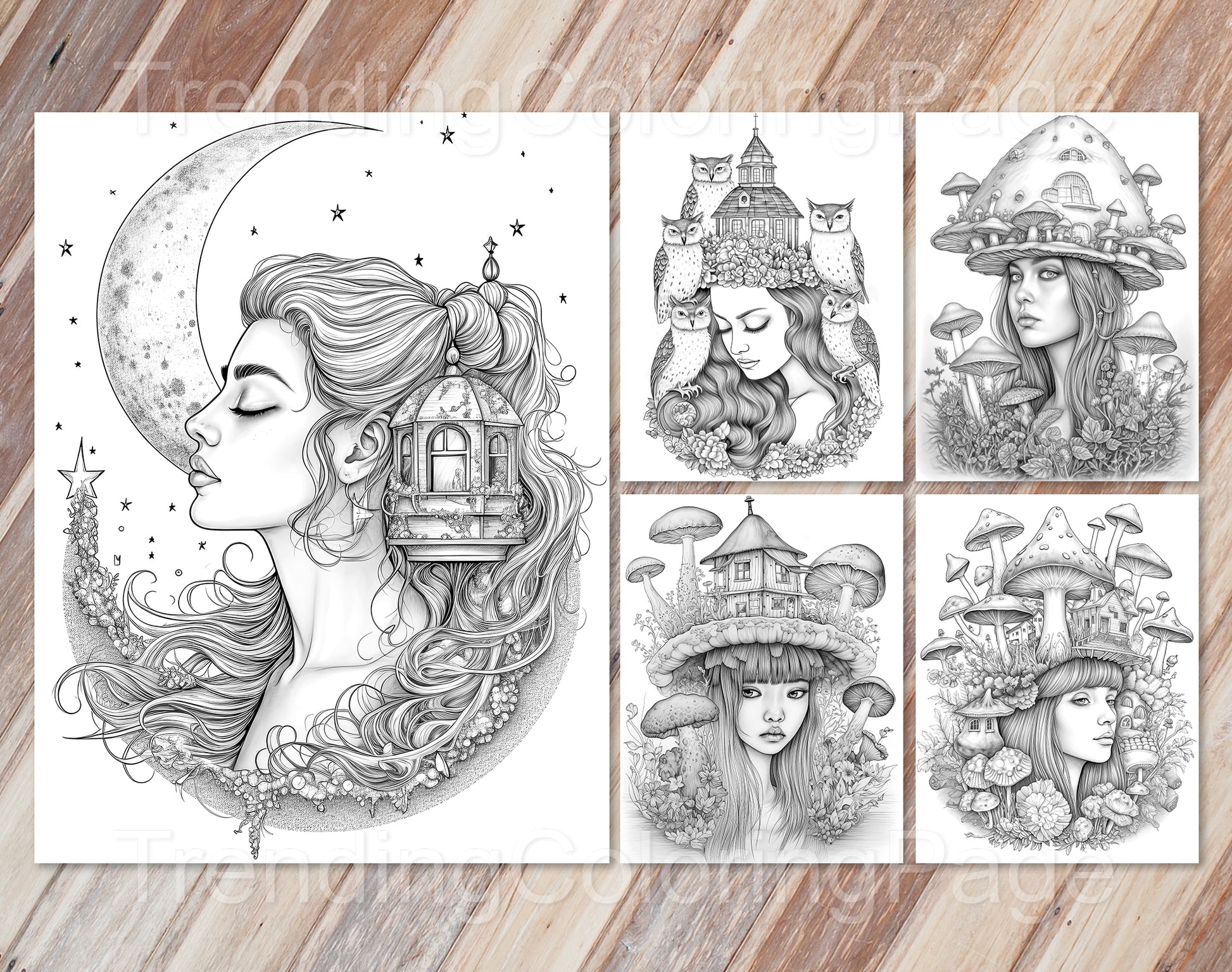25 Fairy Crowned Beauty Grayscale Coloring Pages - Instant Download - Printable PDF Dark/Light