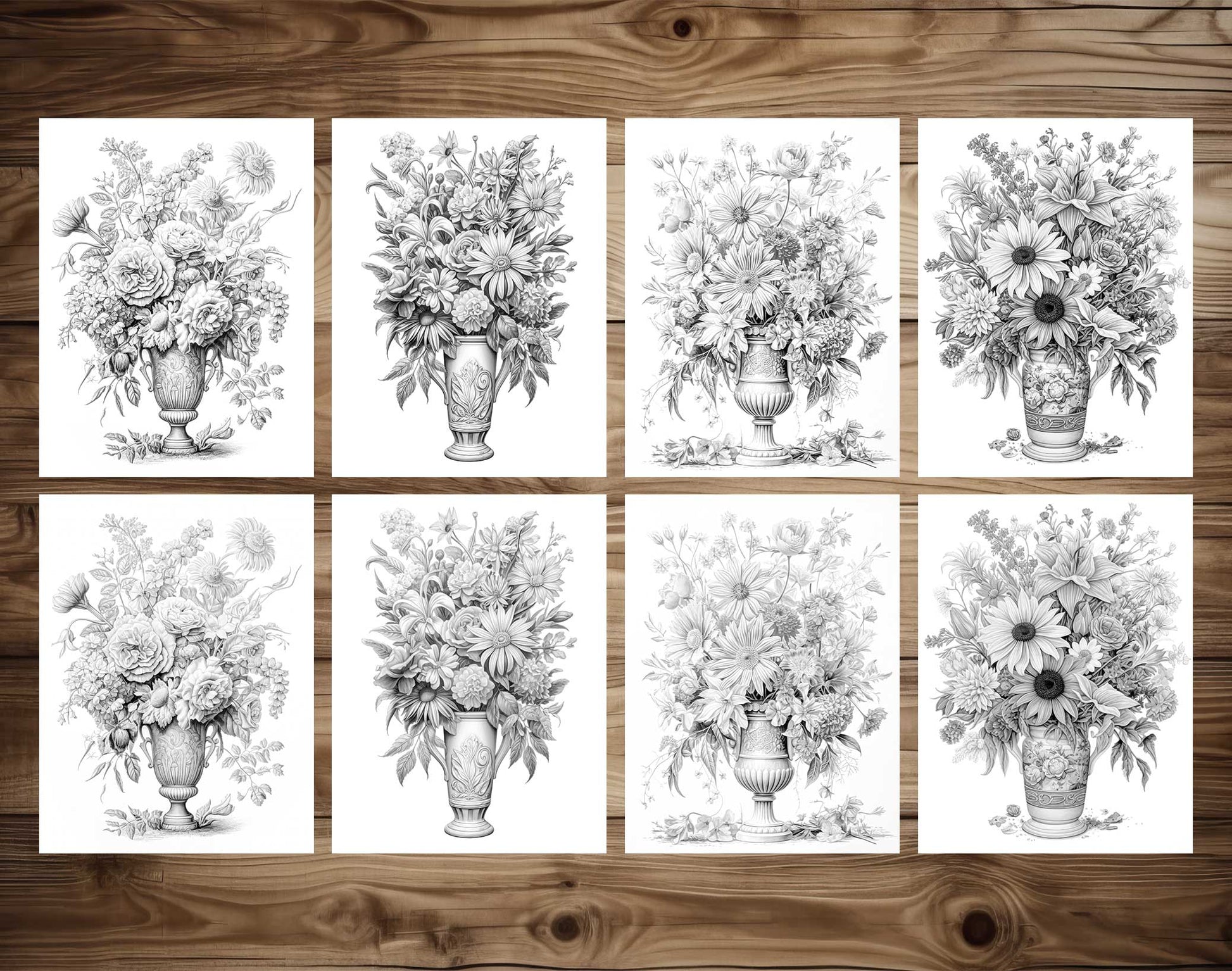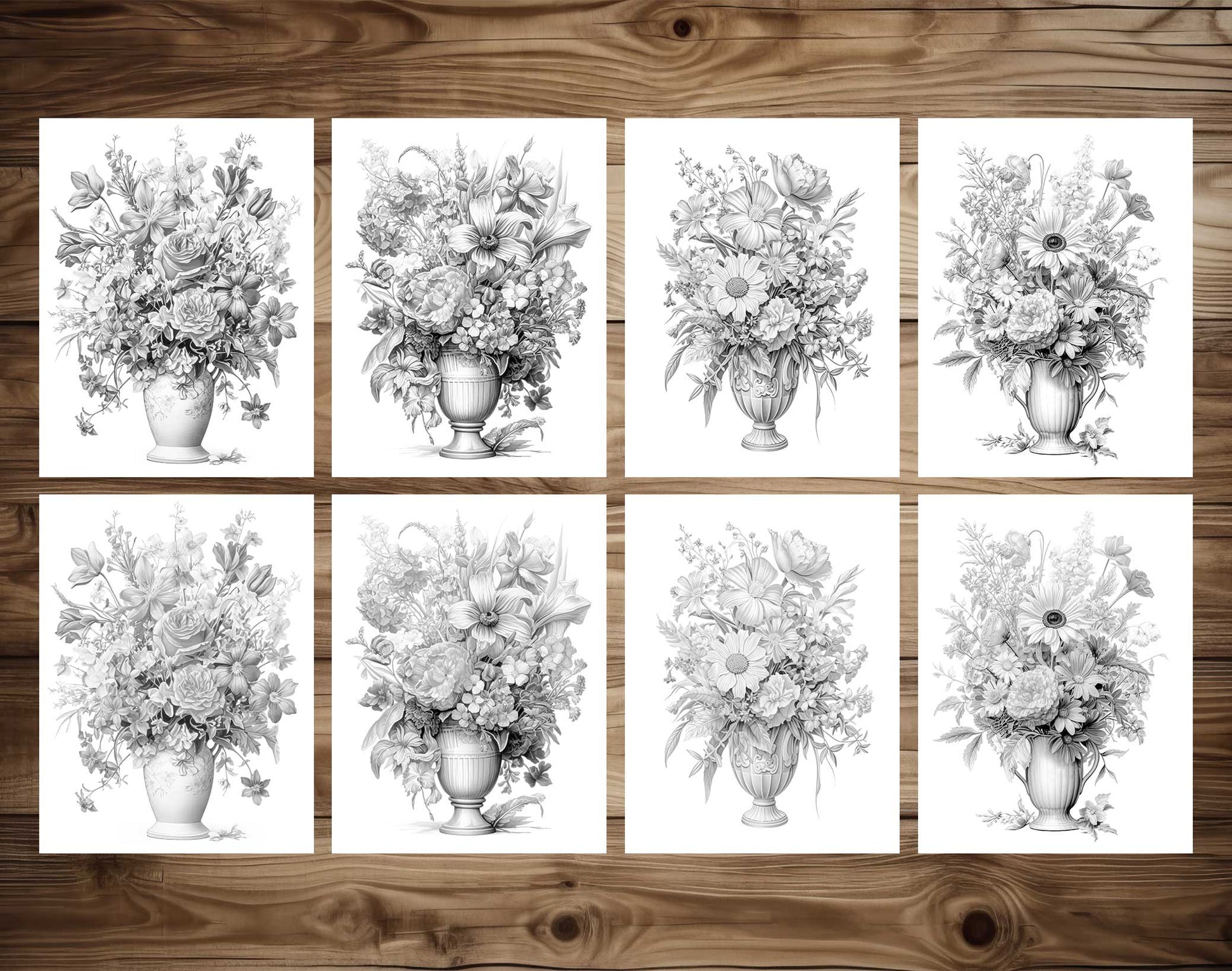 Embrace the timeless beauty of floral arrangements with our "25 Flower Vases Grayscale Coloring Pages". This elegant collection, available for instant download and printable in both dark and light grayscale, features a variety of intricate flower vase designs, each brimming with a unique array of blooms.