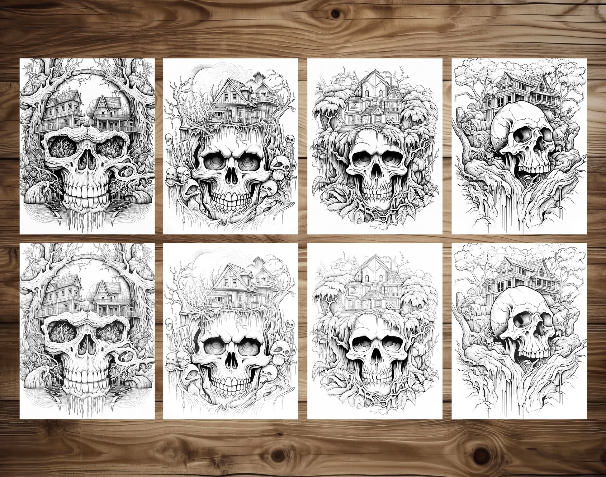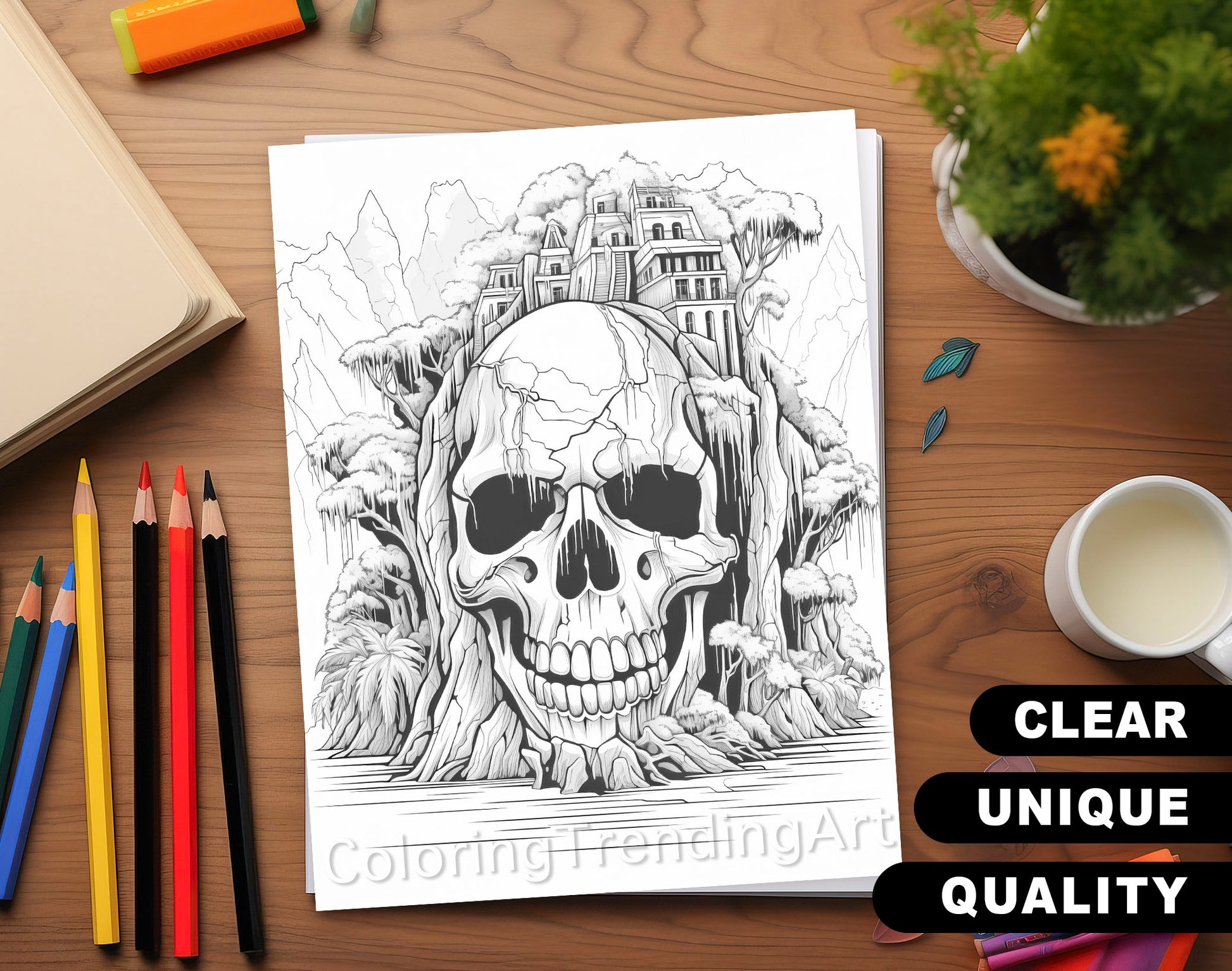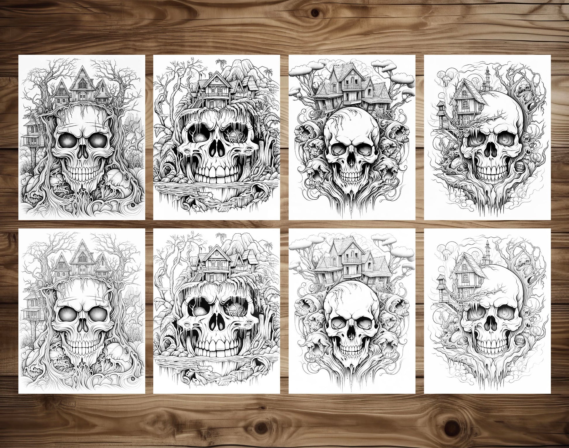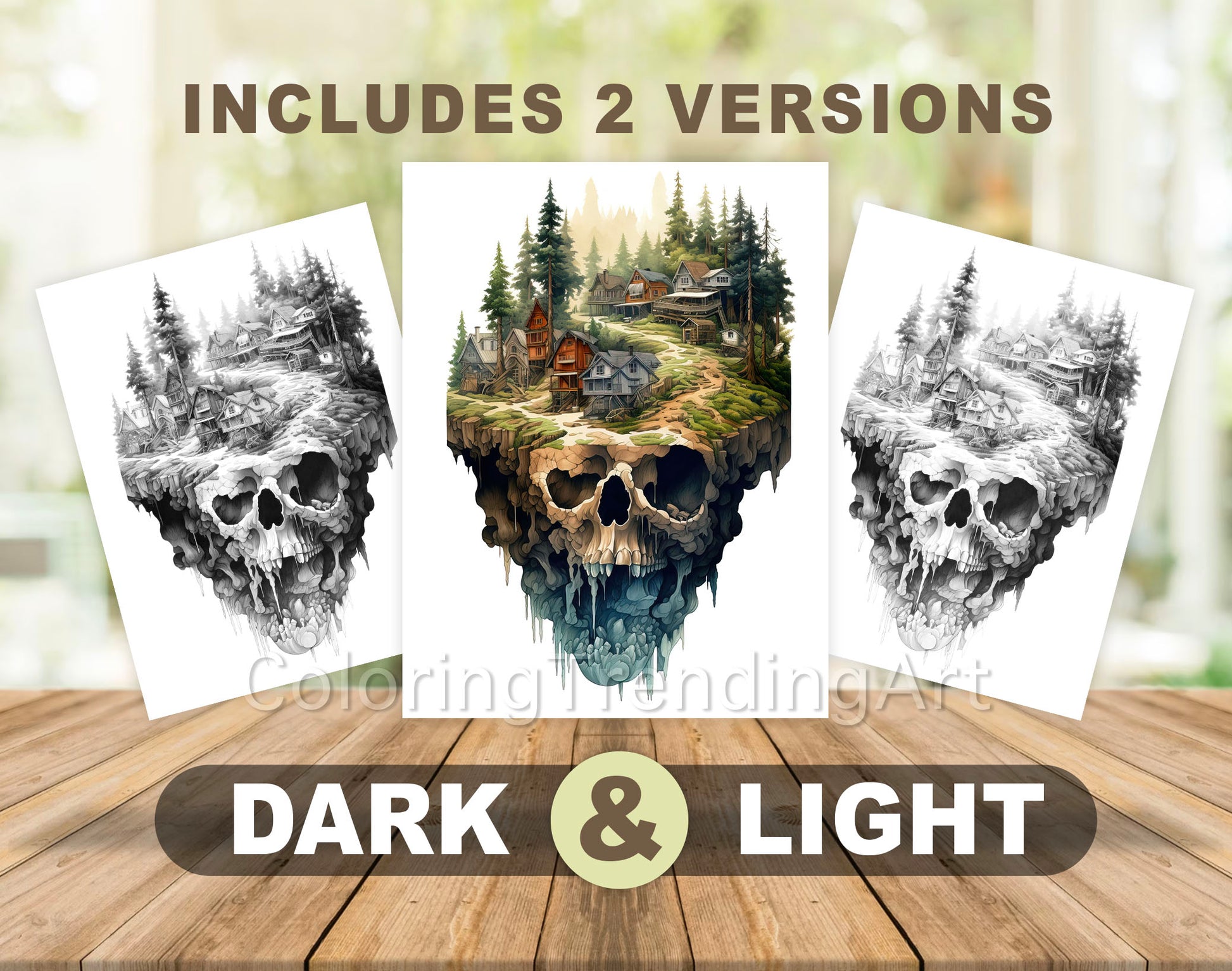 25 Horror Skull Hills Grayscale Coloring Pages - Halloween Coloring - Instant Download - Printable PDF Dark/Light