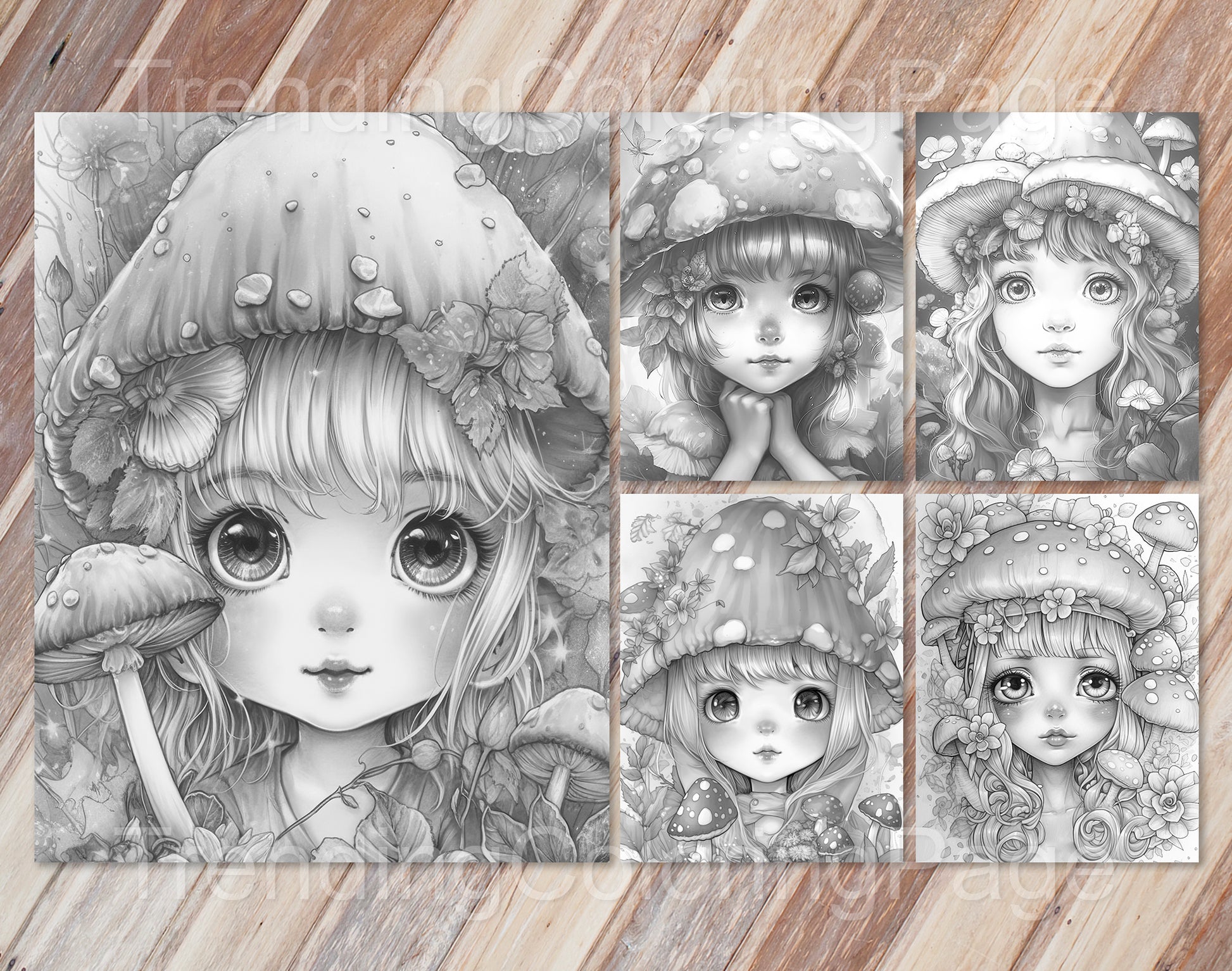 25 Mushroom Fairies Grayscale Coloring Pages - Instant Download - Printable PDF