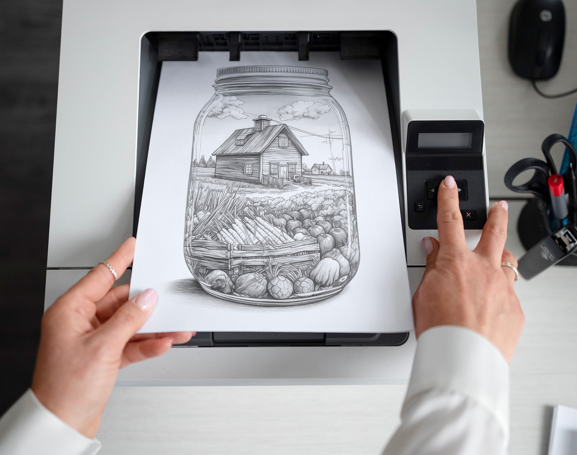 50 Autumn Country In Jar Grayscale Coloring Pages - Instant Download - Printable PDF Dark/Light