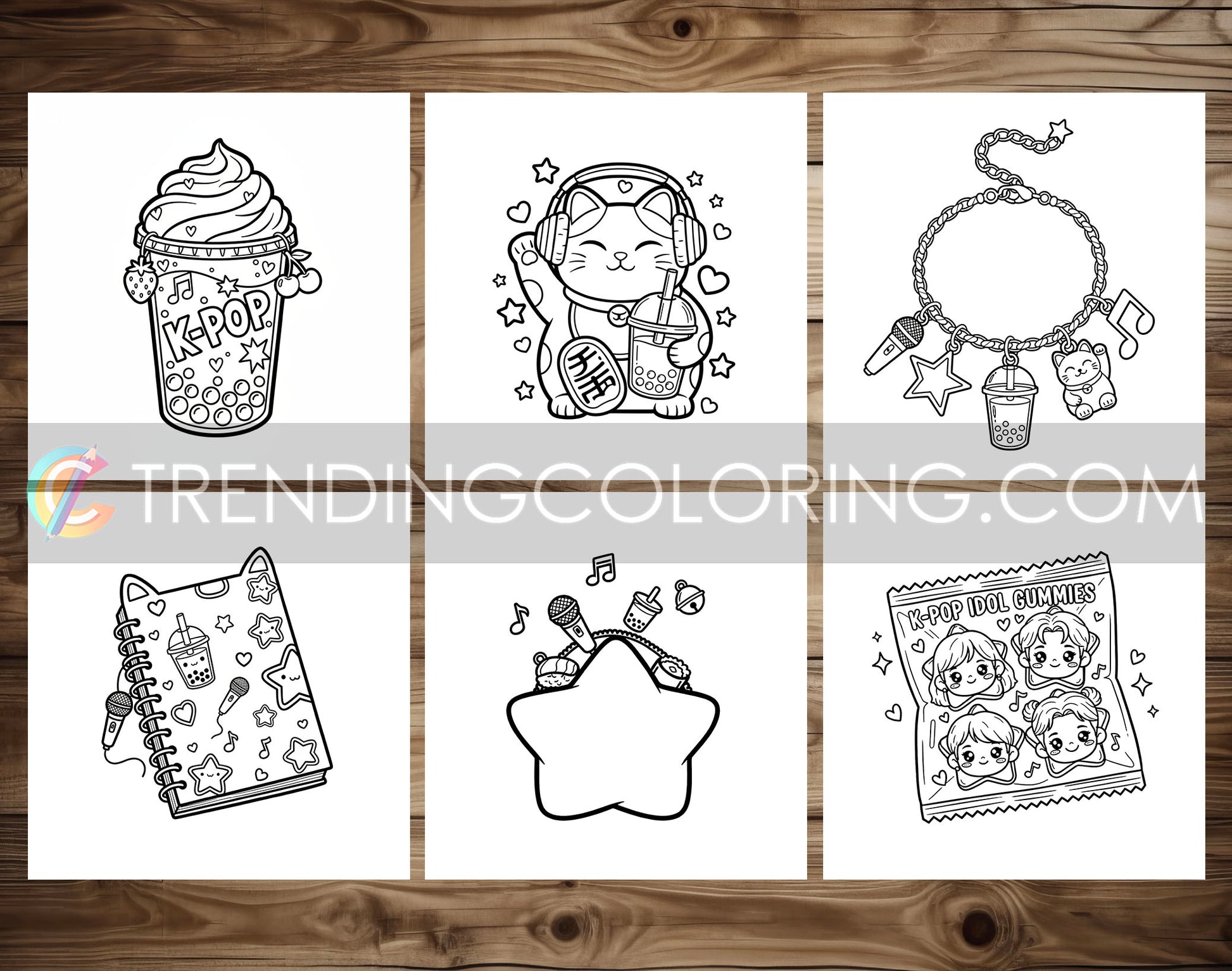 This adorable PDF collection features 30 unique 8.5x8.5 inch illustrations inspired by cute K-Pop aesthetics, fan items, trendy accessories, and lovable characters perfect for all ages.