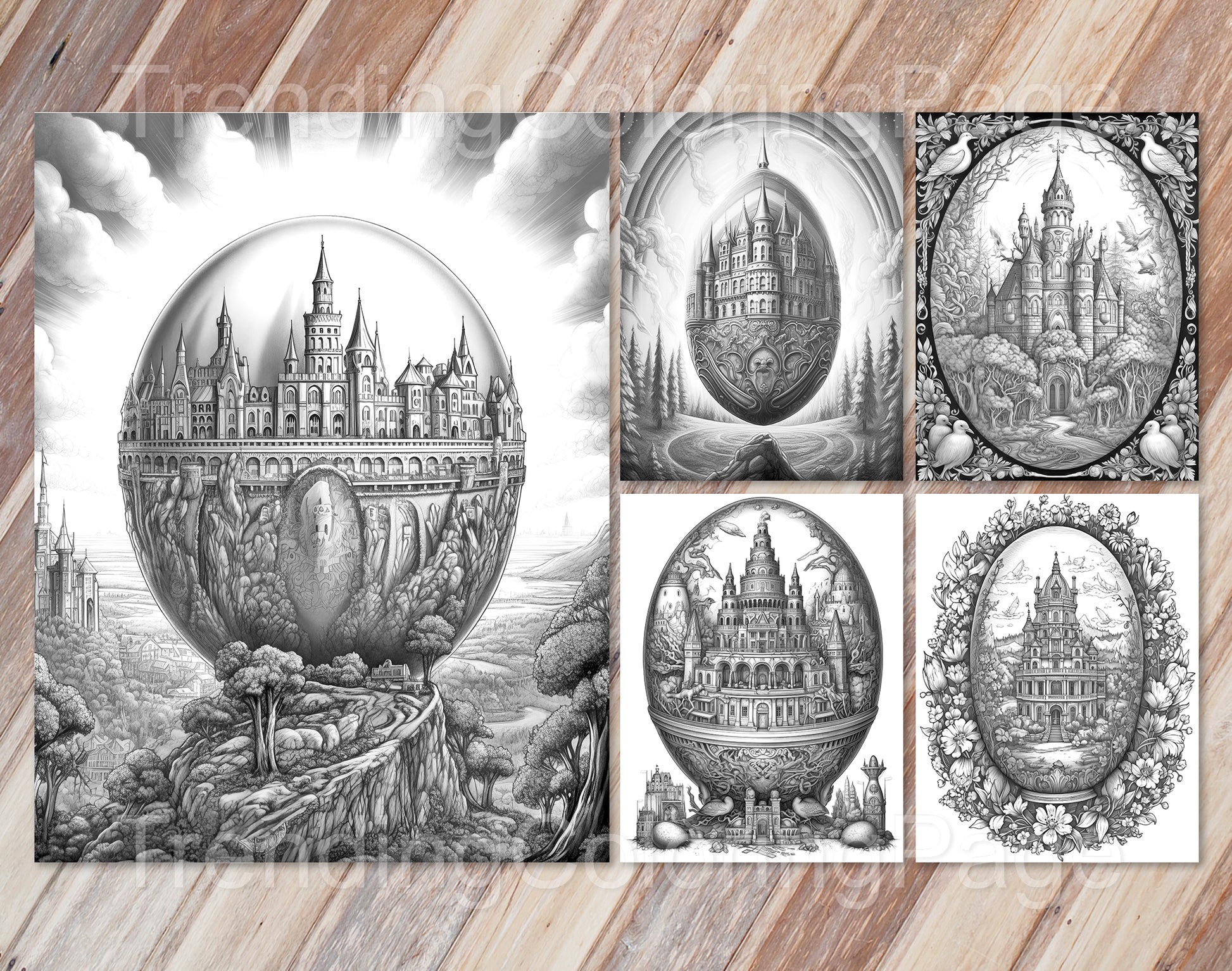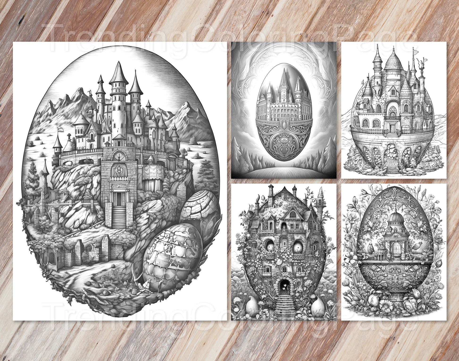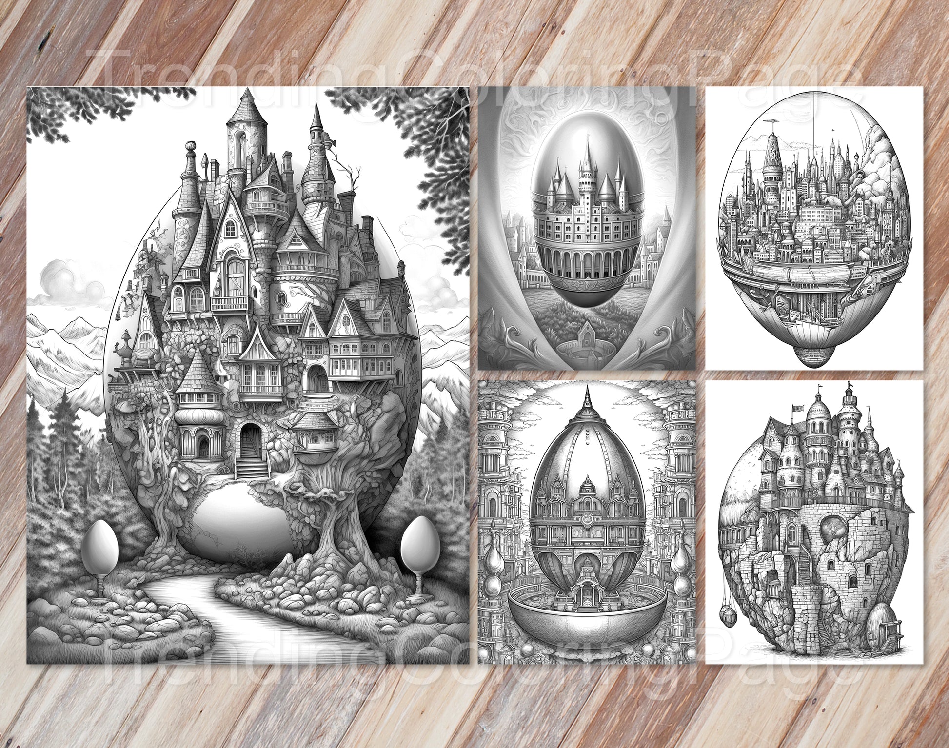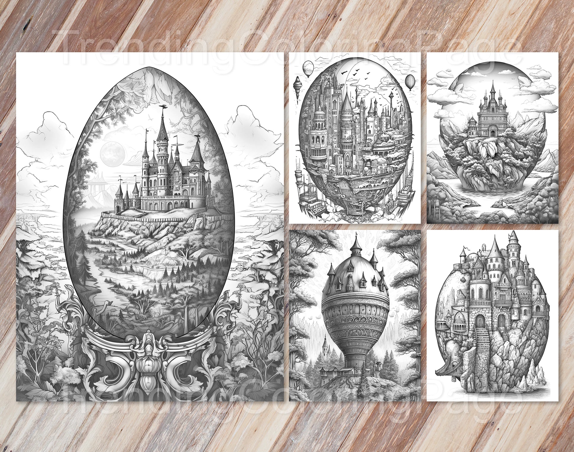 Hop into a whimsical world of festive creativity with our "35 Easter Egg Dreamland Grayscale Coloring Pages". This delightful collection, instantly available for download and printable in both dark and light grayscale, features enchanting scenes of Easter eggs in various imaginative and dreamlike settings.