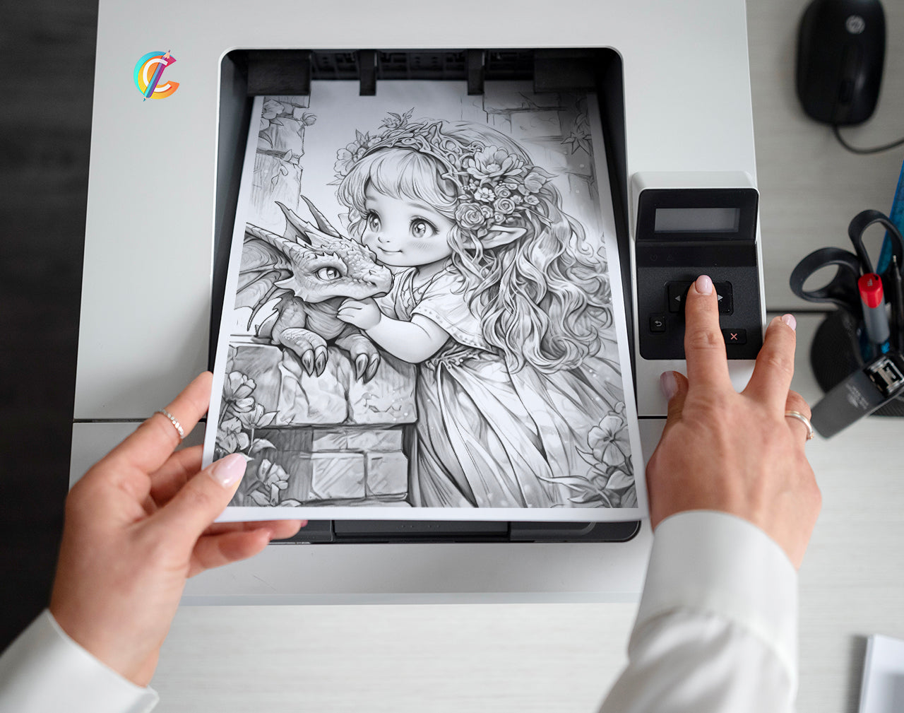 Enter a mystical realm with this set of 35 Enchanting Fairies & Dragons Grayscale Coloring Pages. Each page is meticulously designed to provide adults with a unique and therapeutic coloring activity.