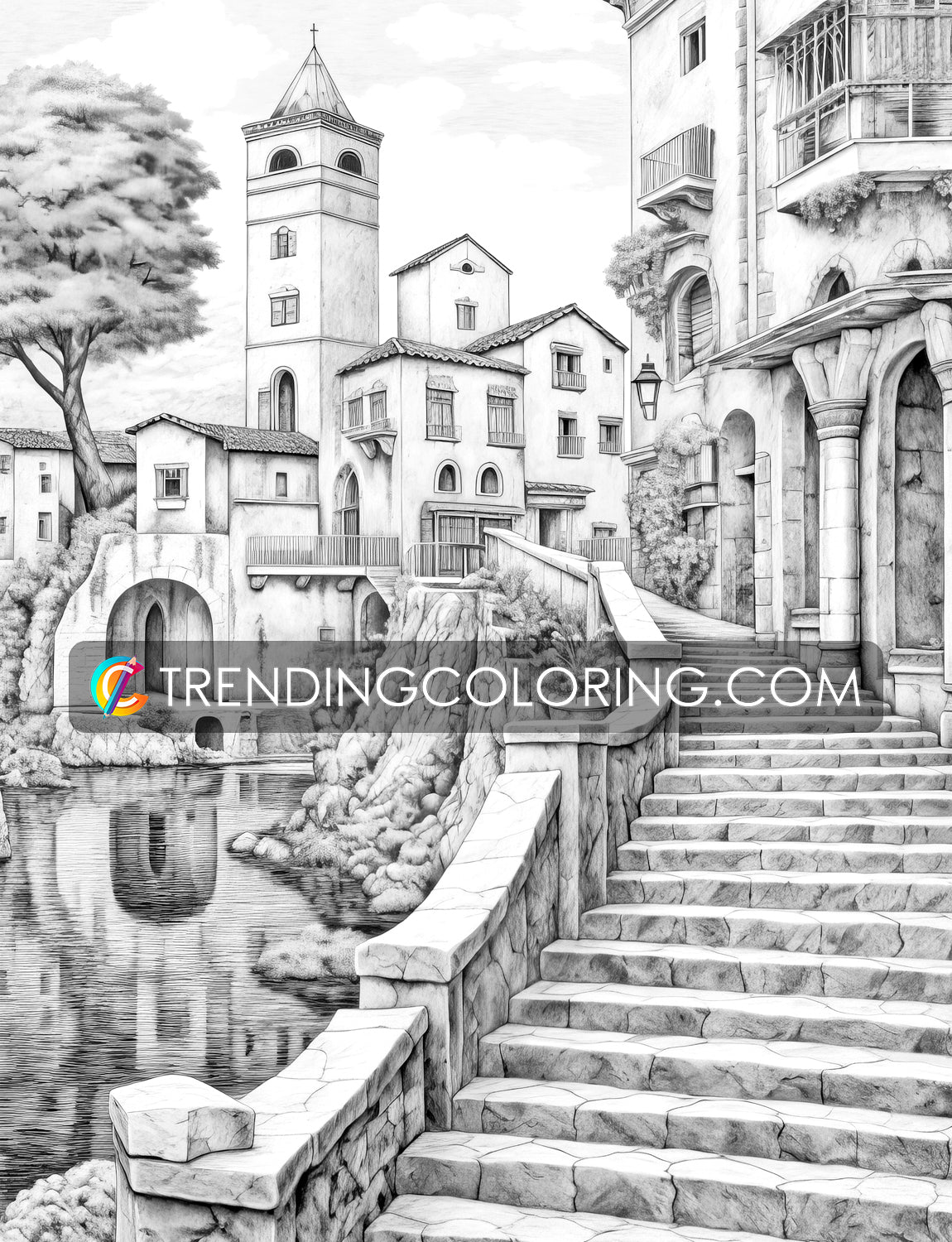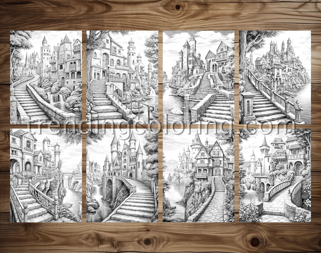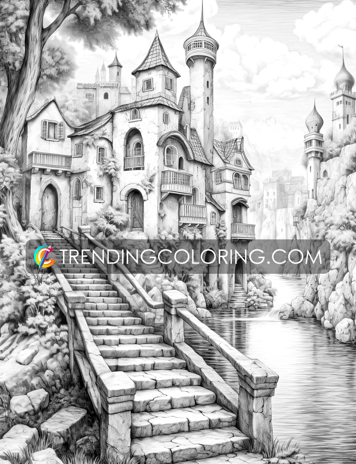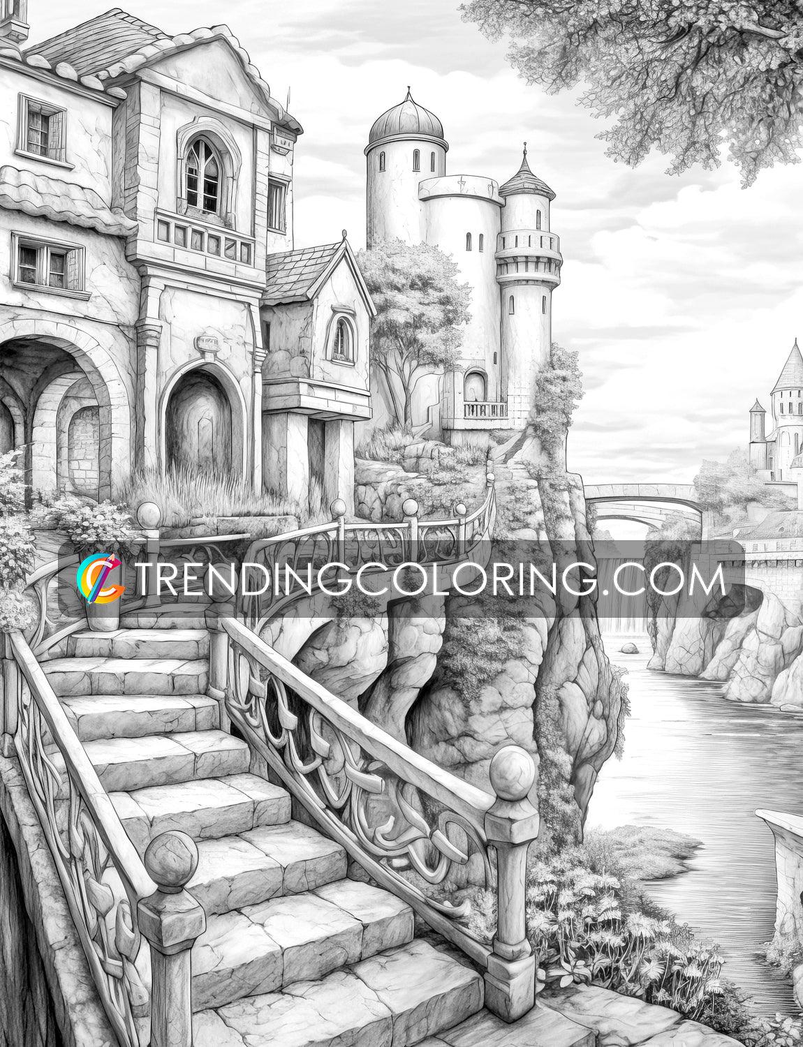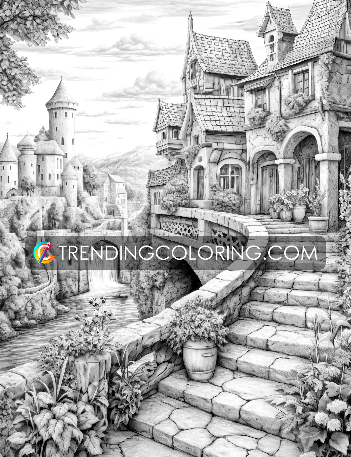 40 Medieval Town Grayscale Coloring Pages - Instant Download - Printable PDF