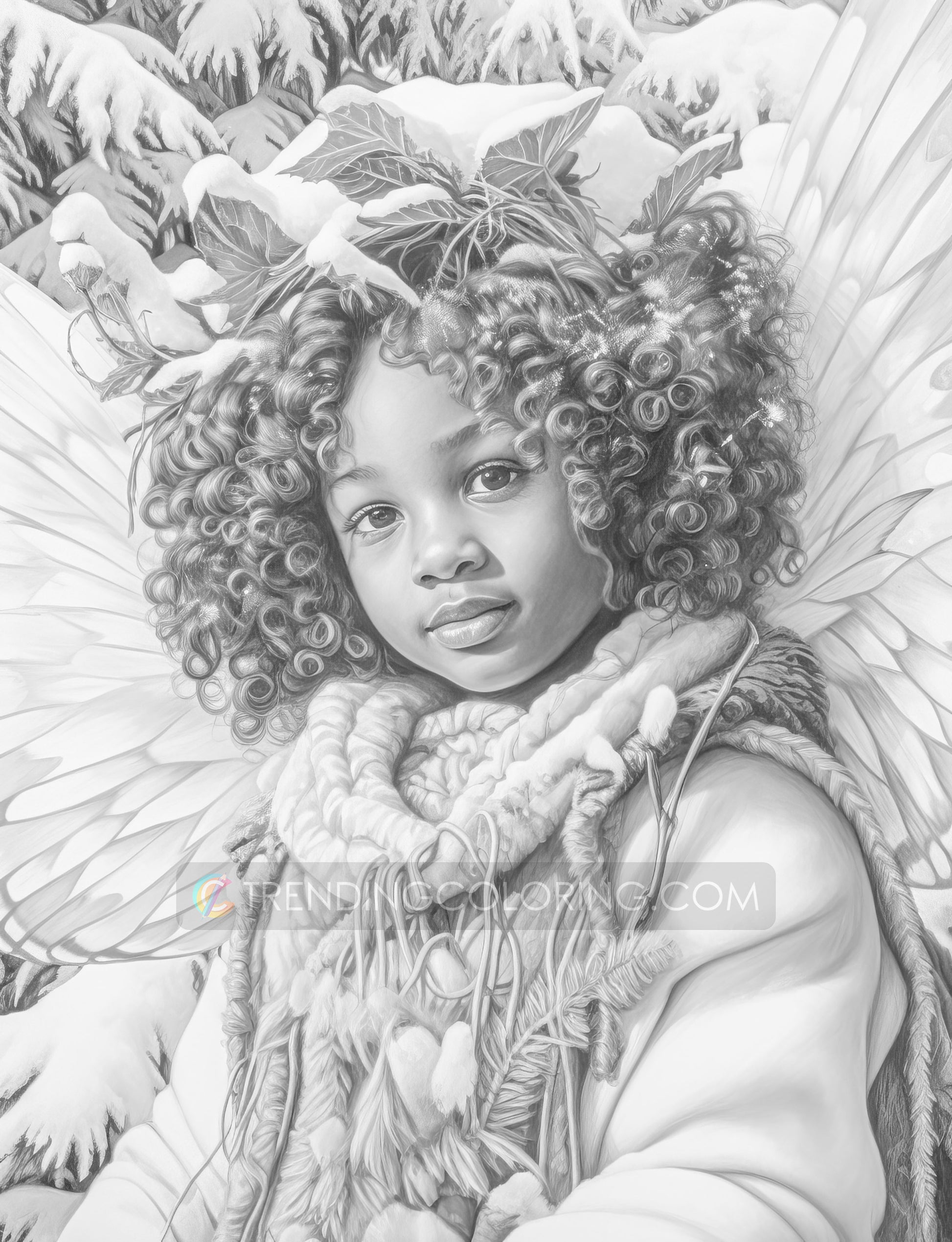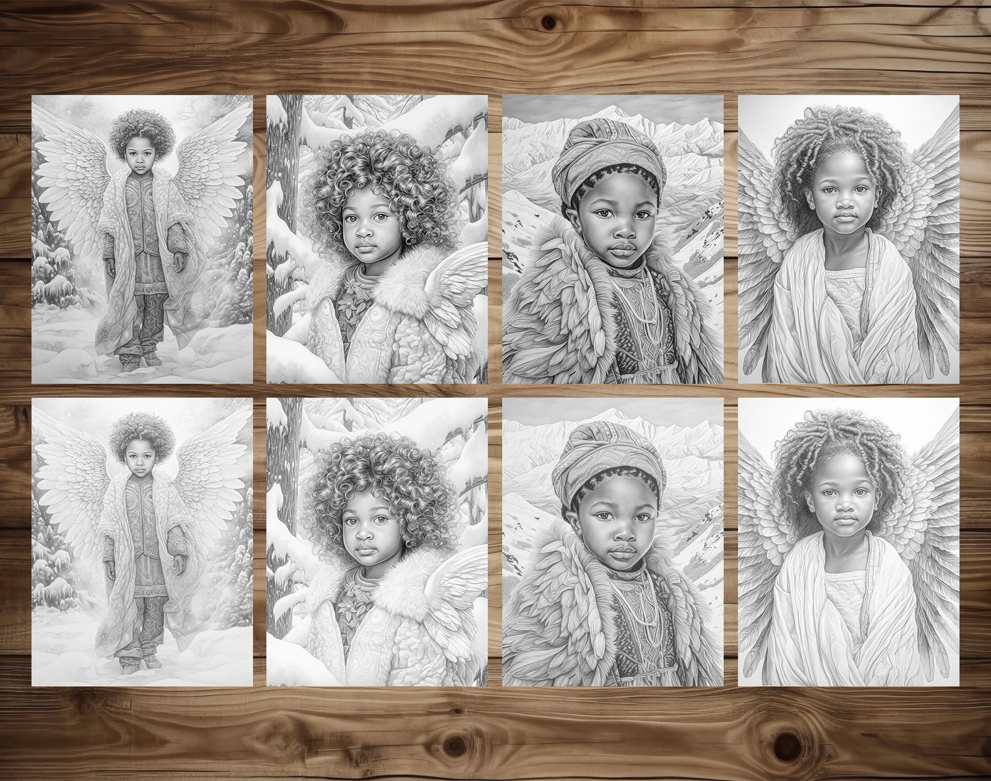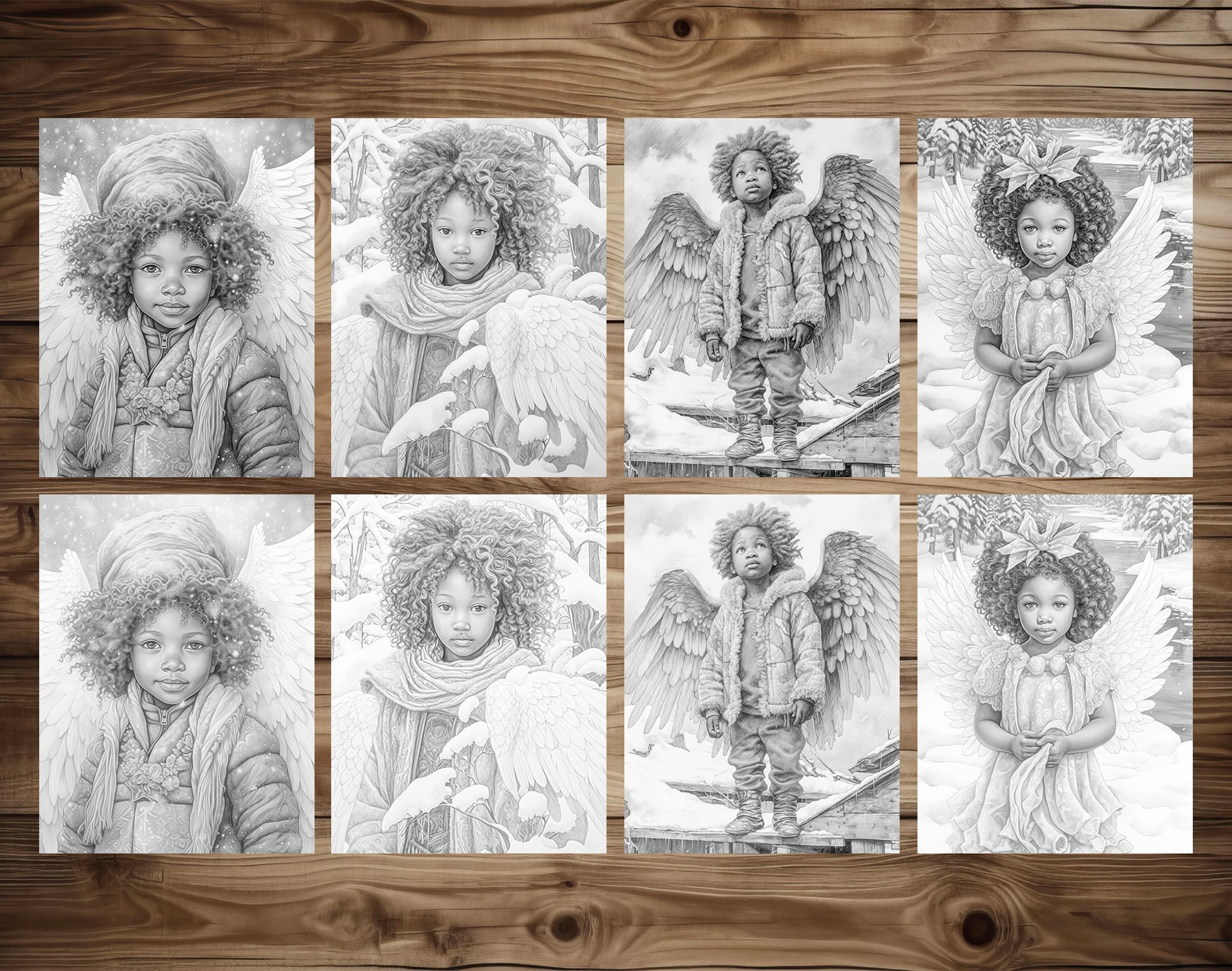 50 African Angels In Winterland Grayscale Coloring Pages - Instant Download - Printable PDF Dark/Light