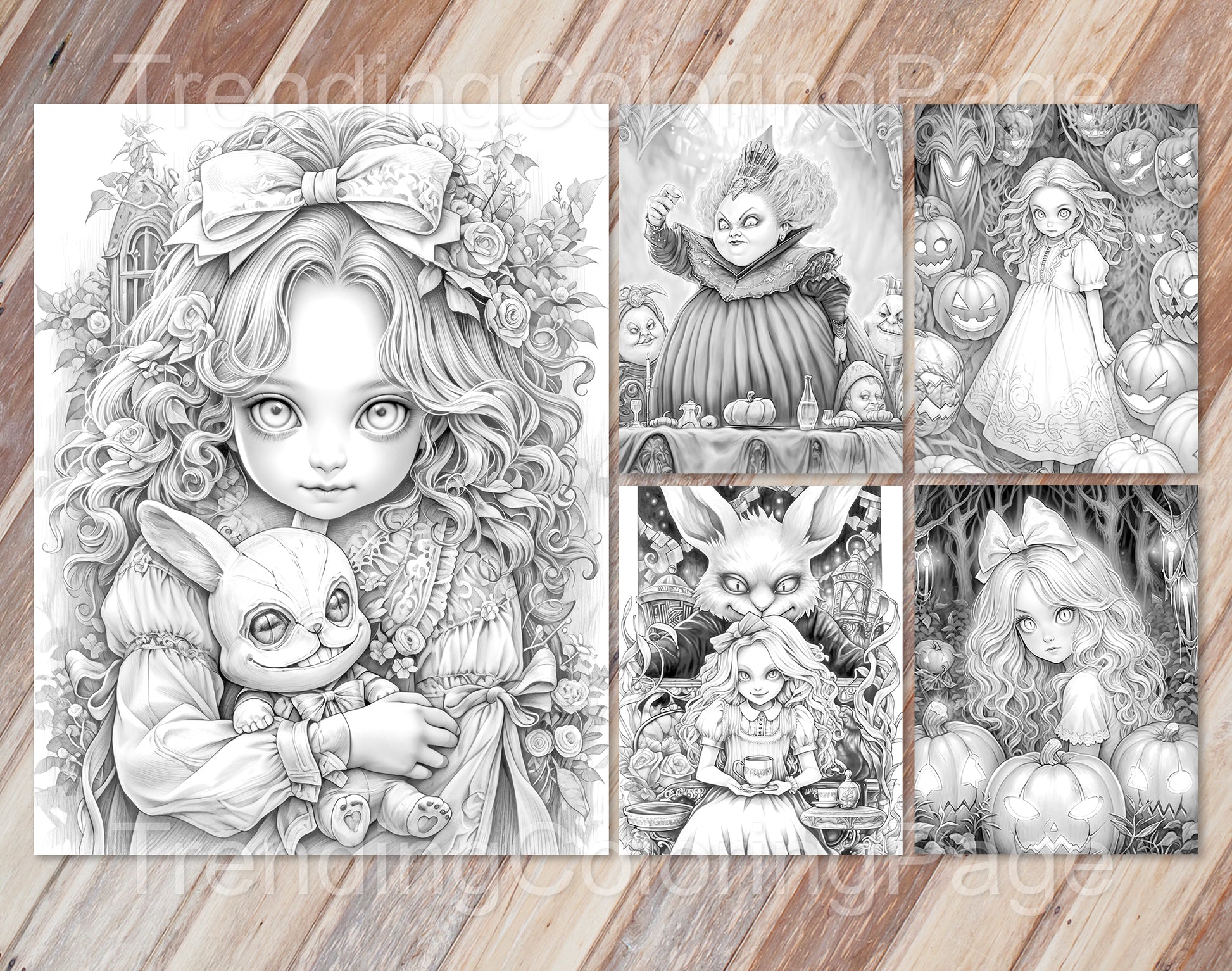 - 50 Expertly Crafted Alice in Halloweenland Grayscale Pages