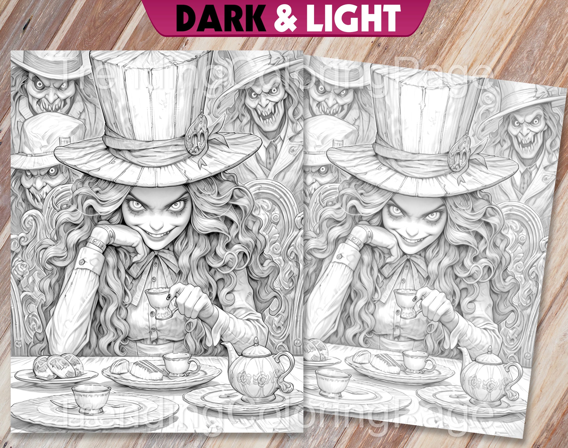 50 Alice in Halloweenland Grayscale Coloring Pages - Halloween Coloring - Instant Download - Printable PDF Dark/Light