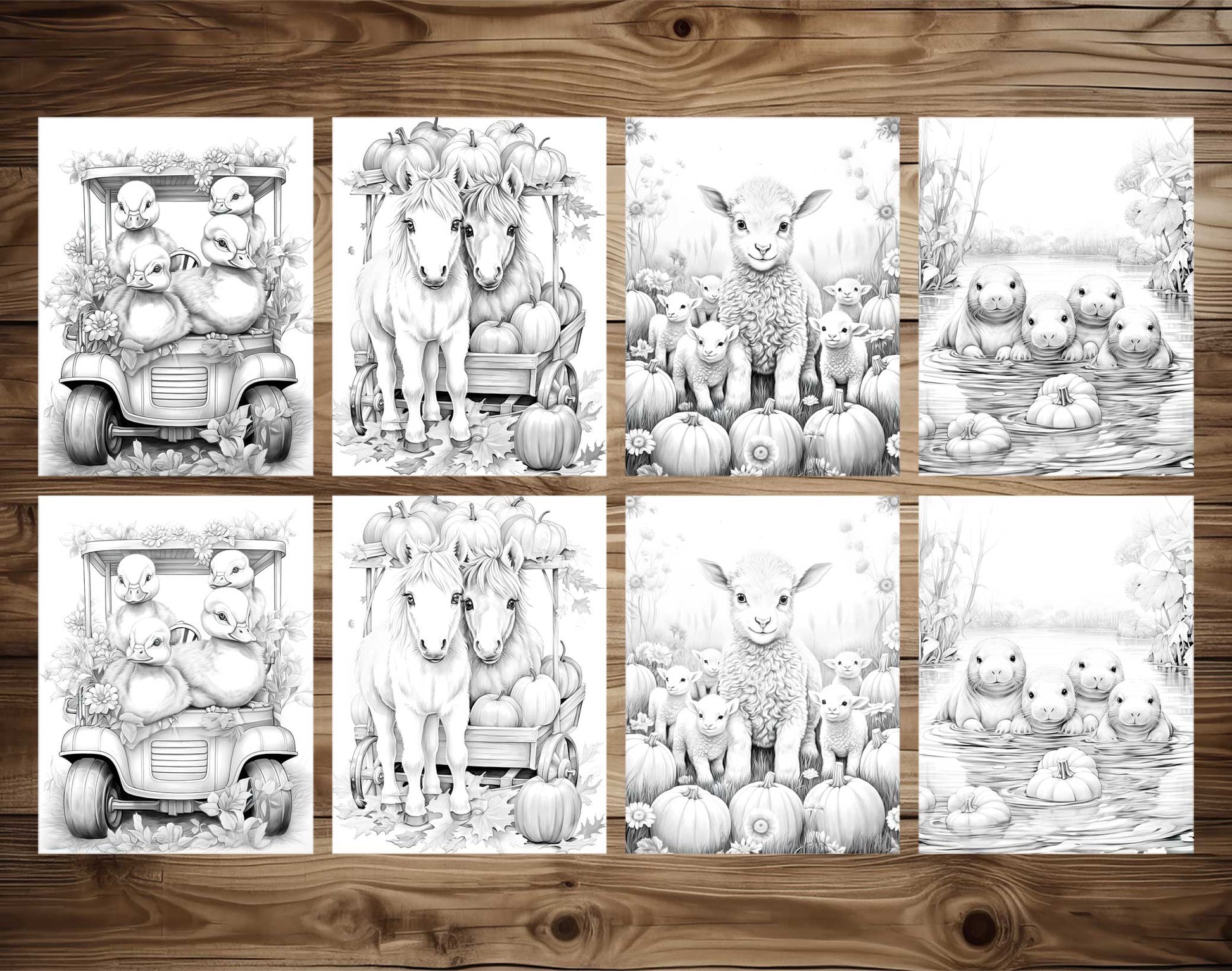 50 Autumn Critters Grayscale Coloring Pages - Instant Download - Printable PDF Dark/Light