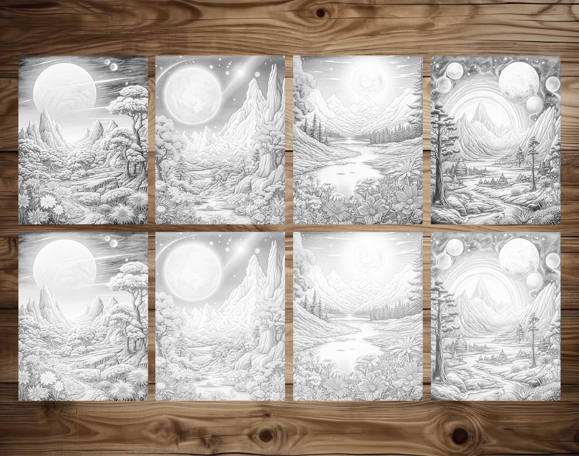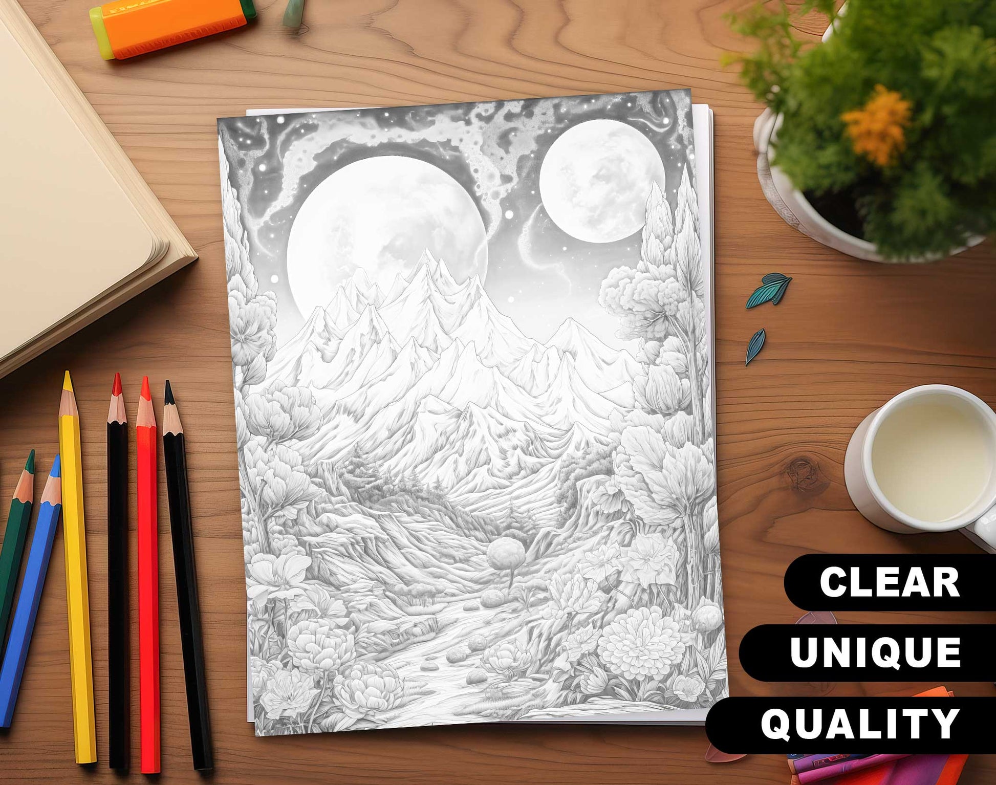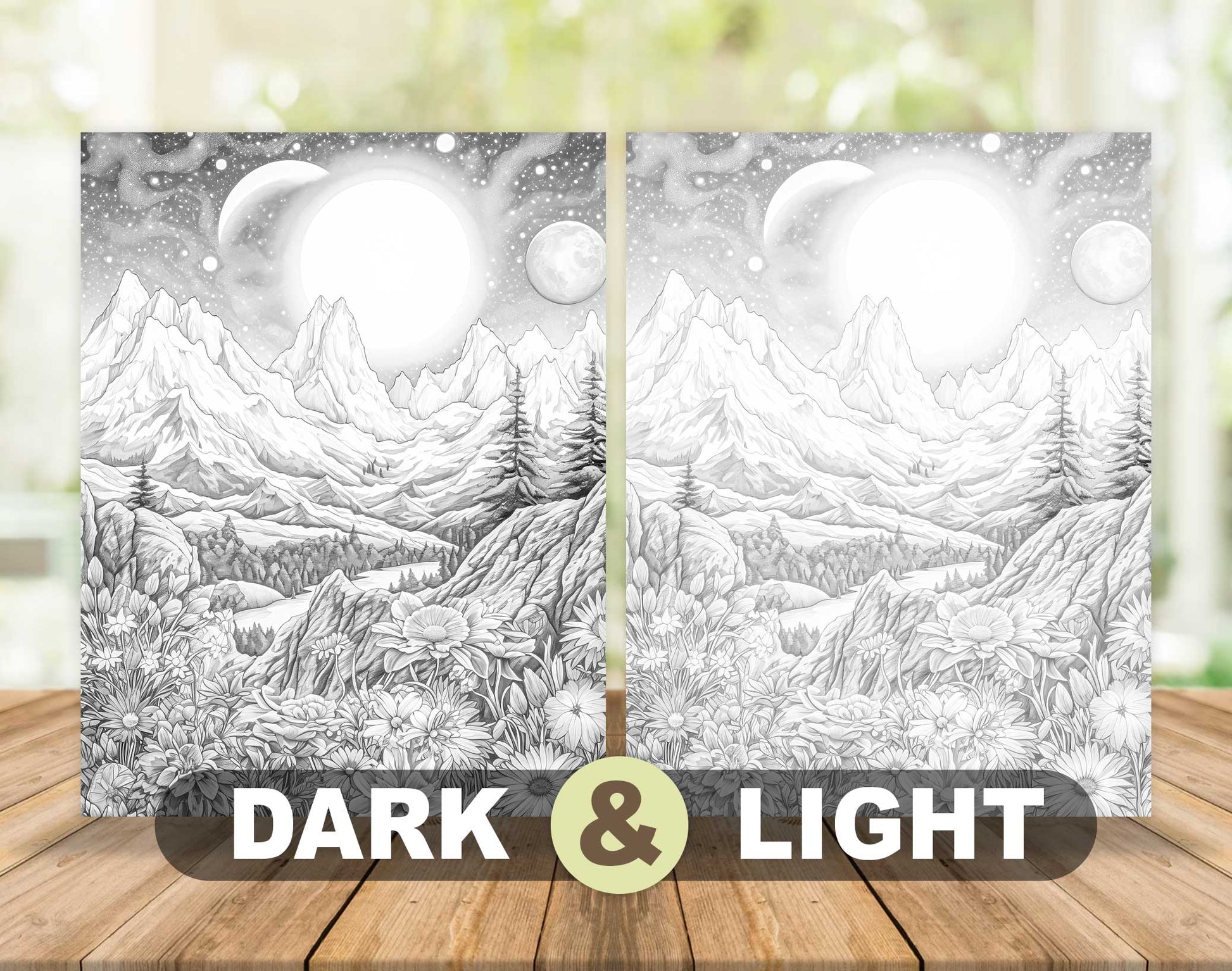 As you delve into these pages, you'll explore the beauty and majesty of the universe, from swirling galaxies and radiant stars to intricate constellations and distant planets. The grayscale shading adds depth and dimension to these celestial scenes, guiding your coloring journey and allowing you to create vibrant, dynamic depictions of the cosmos. Whether you prefer the stark contrasts of the dark grayscale or the subtle gradations of the light grayscale, these pages offer a versatile and immersive coloring experience.
