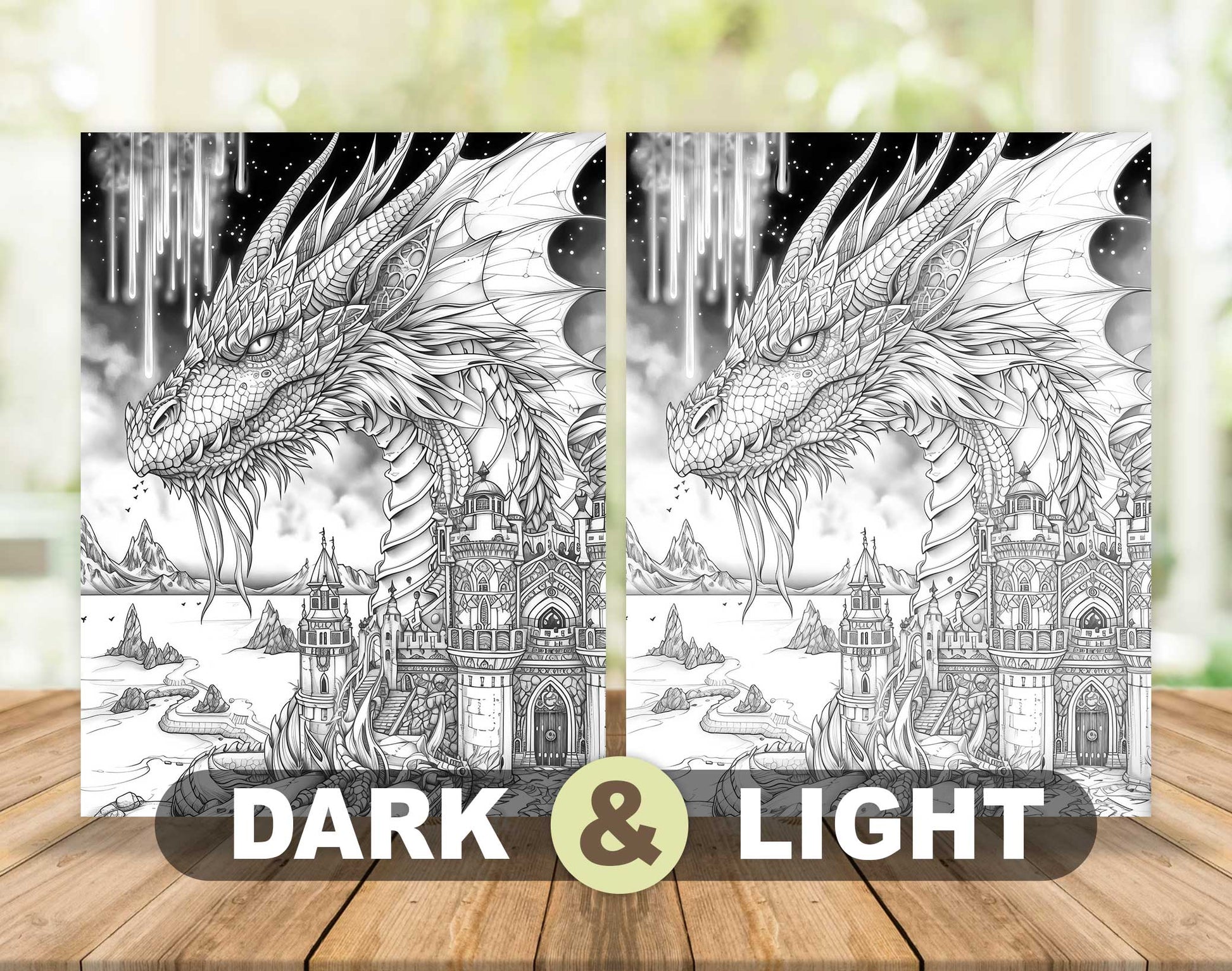 50 Dragon Castle Grayscale Coloring Pages - Instant Download - Printable PDF Dark/Light