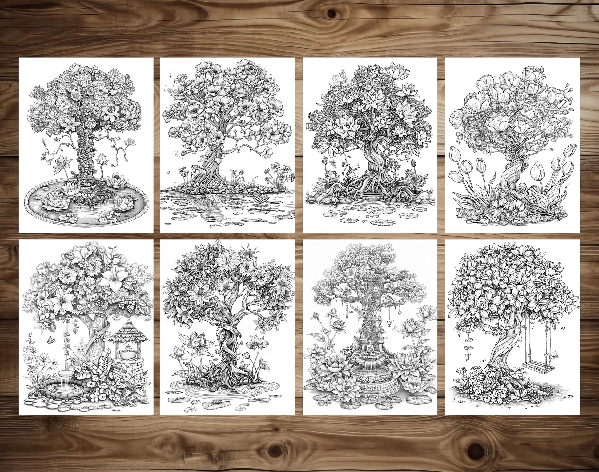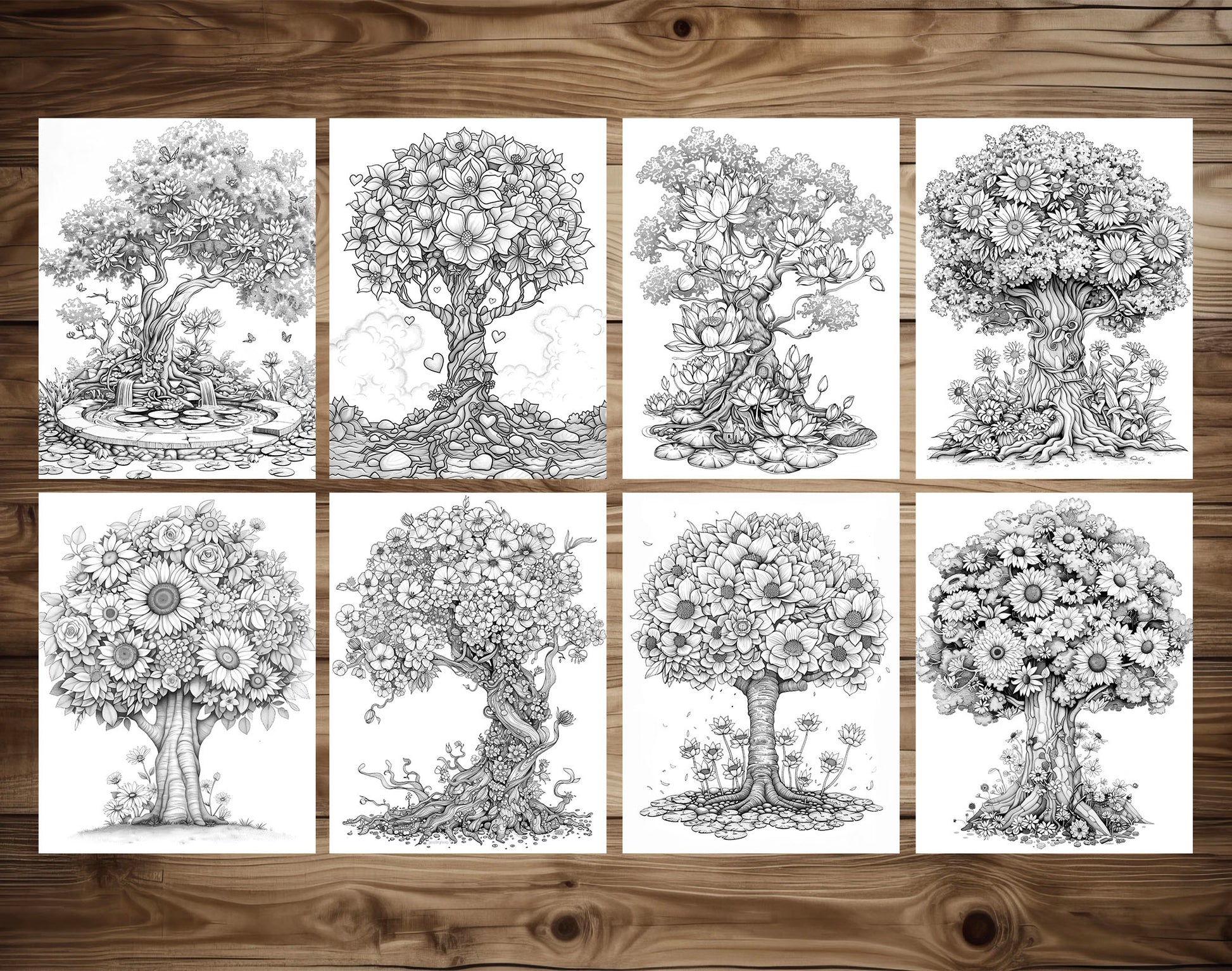 50 Floral Tree Coloring Pages - Instant Download - Printable PDF