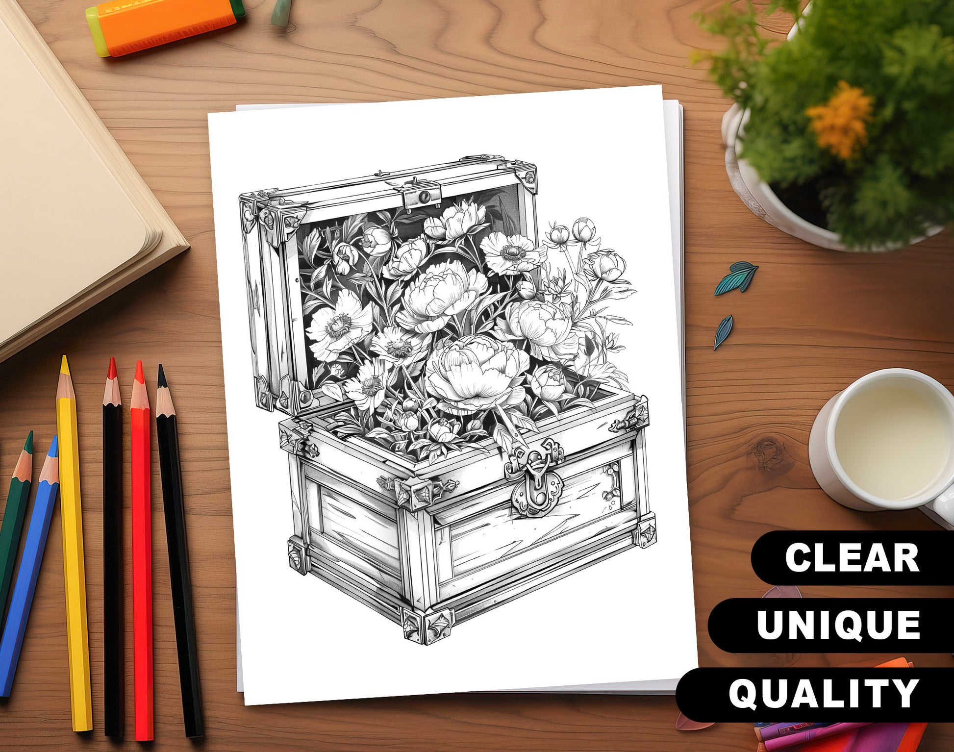 Unearth a vibrant, tranquil world within these 50 Flower Chest Box Grayscale Coloring Pages. Inside each intricately illustrated treasure chest awaits a blossoming secret garden of floral arrangements, just waiting to be painted with color.