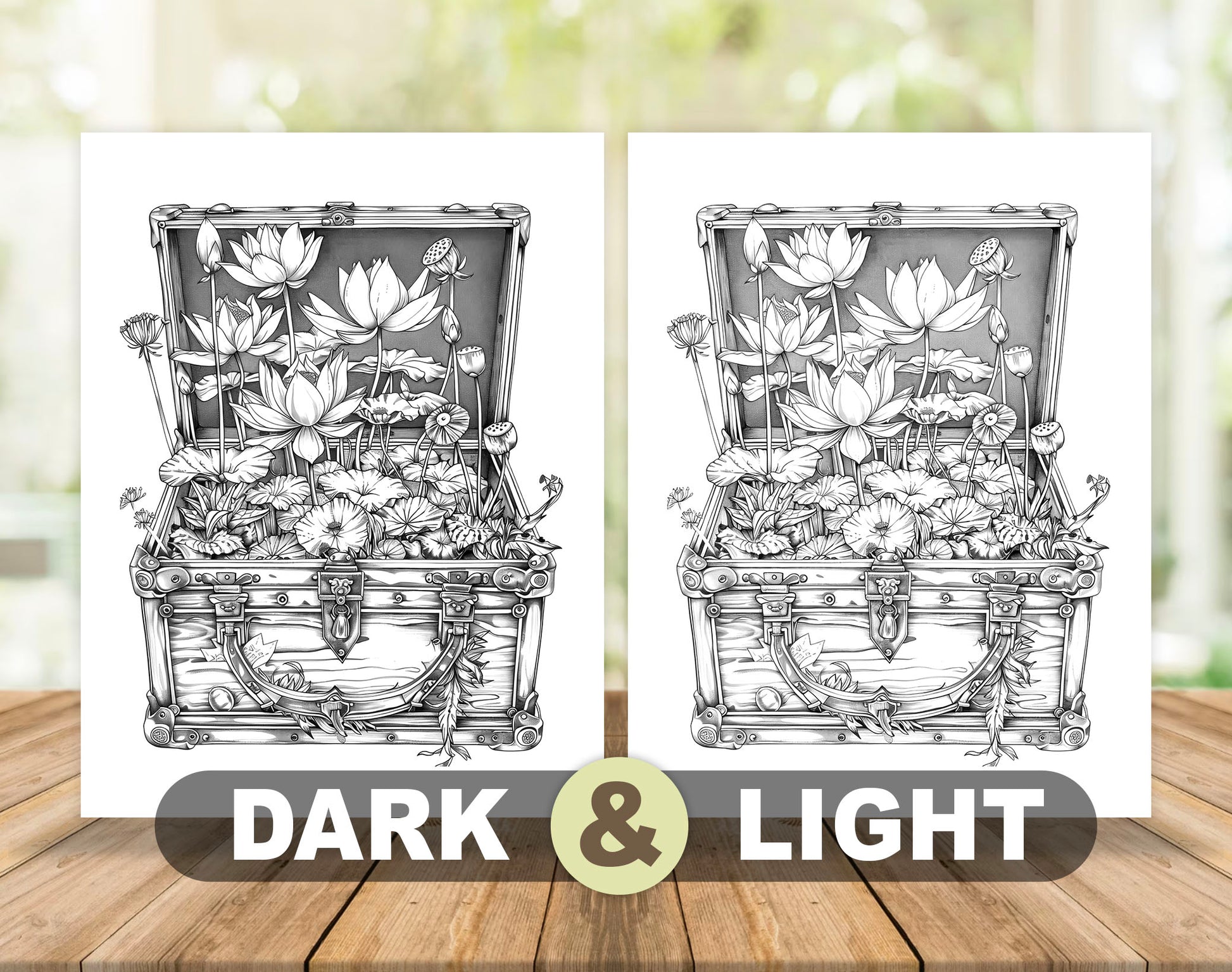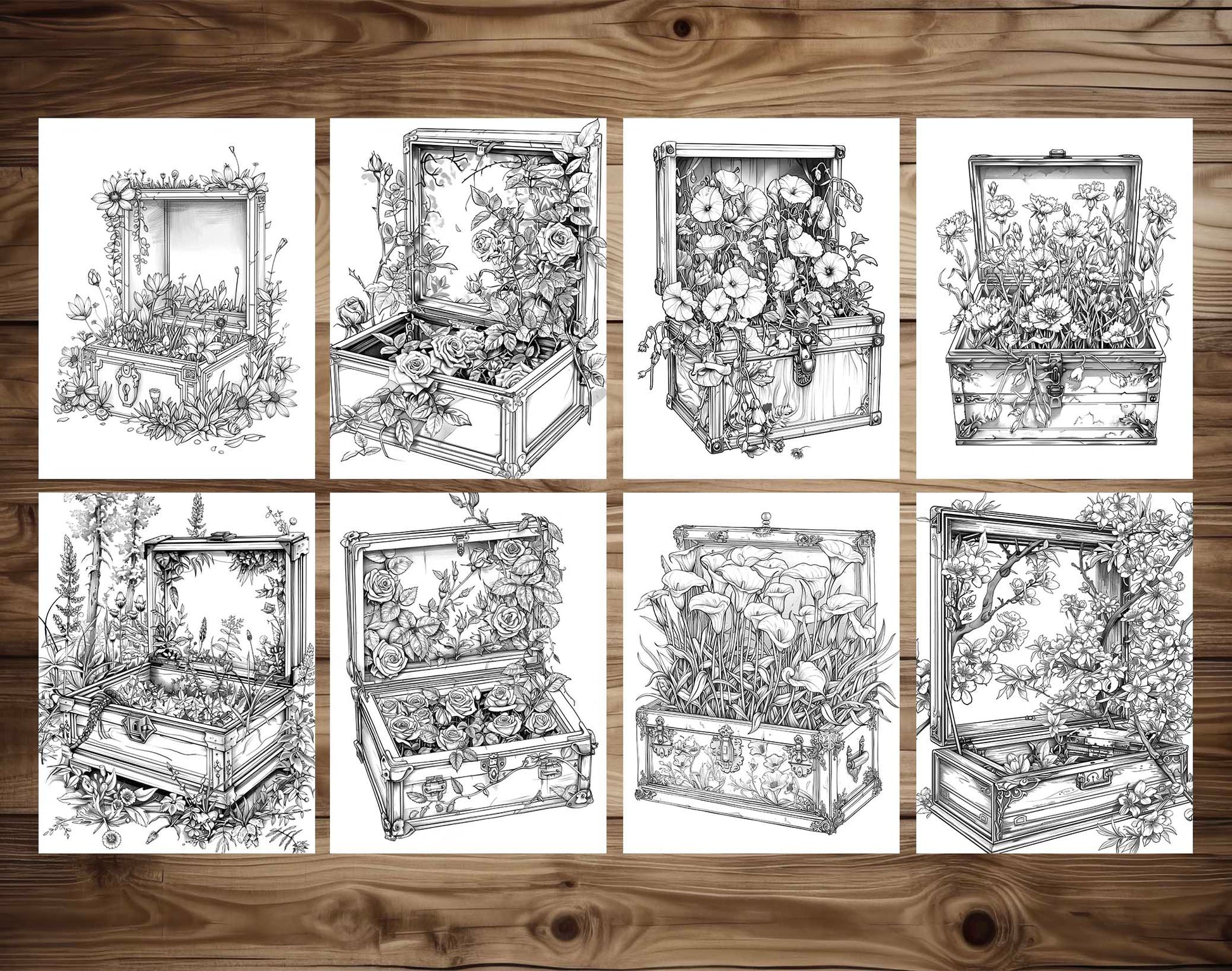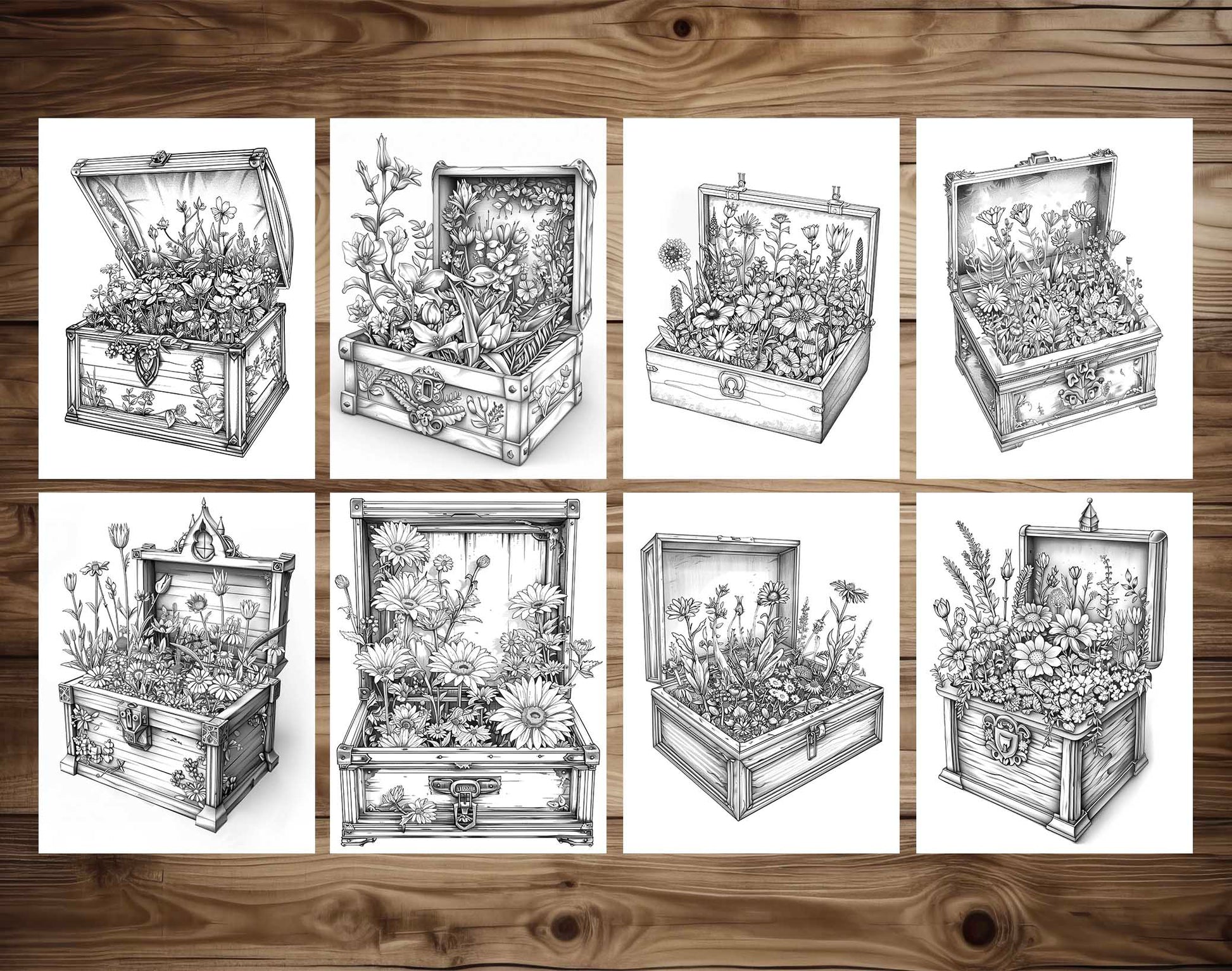 50 Flower Chest Box Grayscale Coloring Pages - Instant Download - Printable PDF Dark/Light