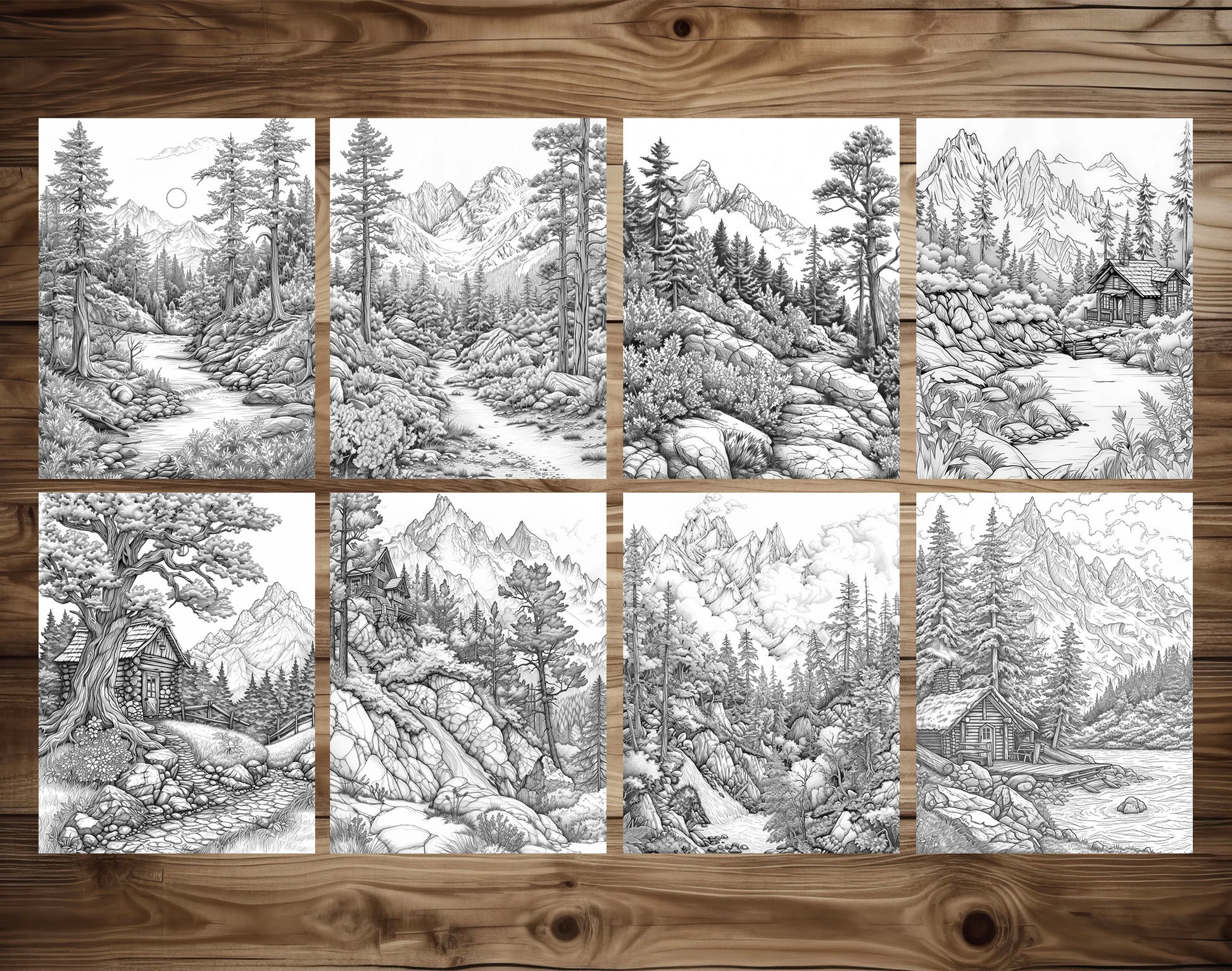 Escape into enchanting woodland settings with 50 Forest Scene Grayscale Coloring Pages. This nature-inspired collection captures a variety of lush forest habitats, tranquil wooded trails and charming forest cottages, offering immersive backdrops to fill with color.