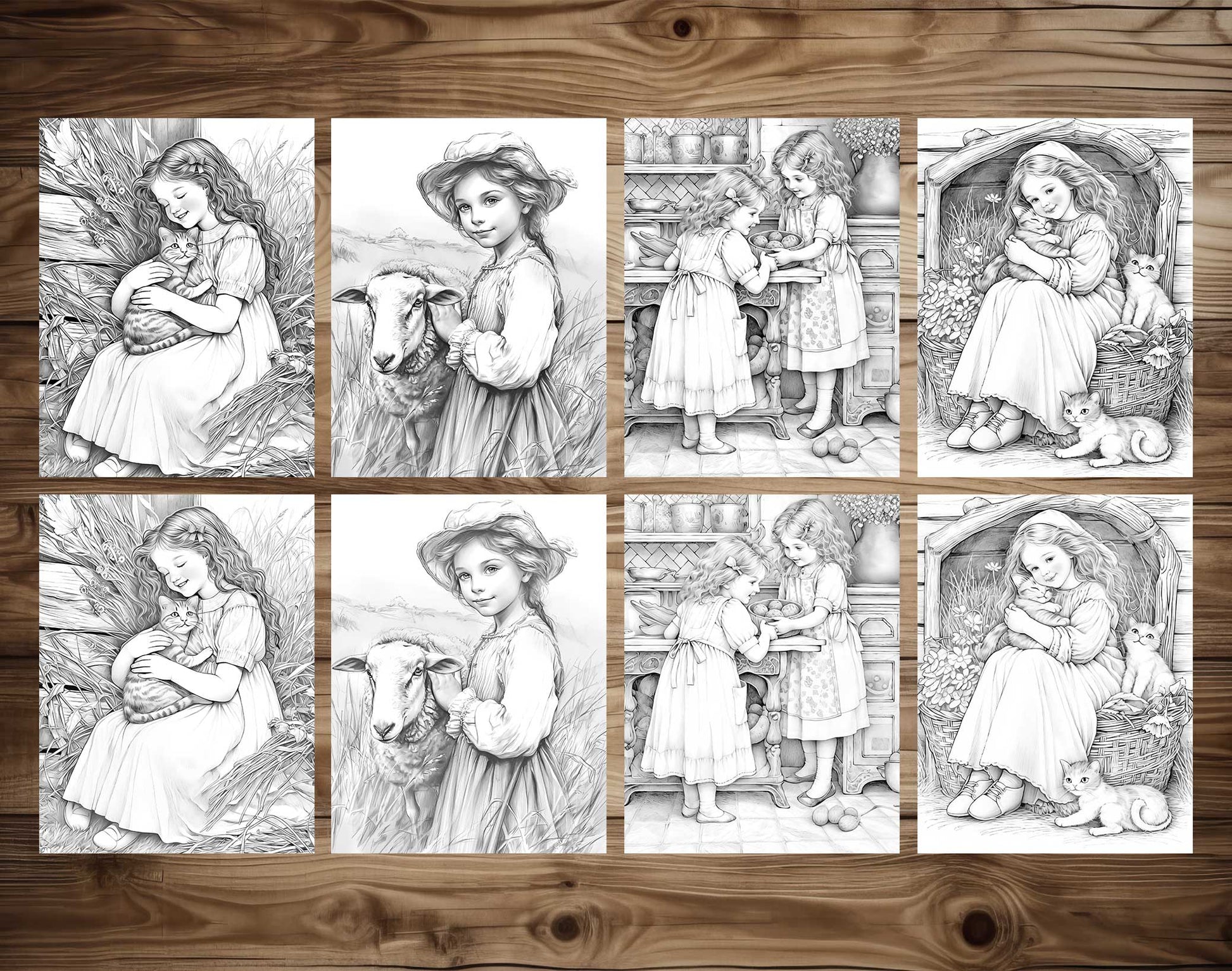 Step back in time to the charming days of old with our "50 Little Prairie Girl Grayscale Coloring Pages". This nostalgic collection, available for instant download and printable in both dark and light grayscale, captures the simplicity and beauty of prairie life through the eyes of little girls in various rustic and pastoral settings.