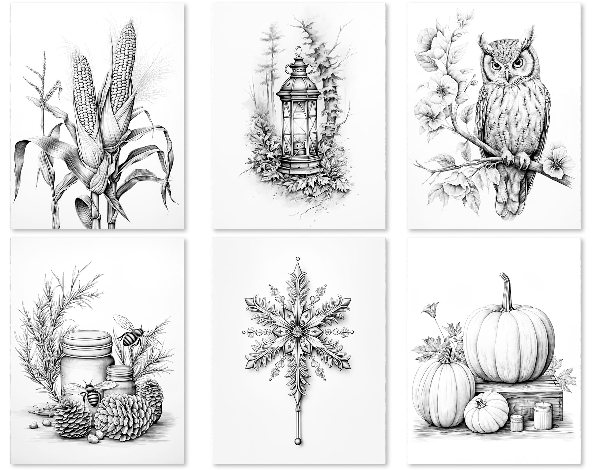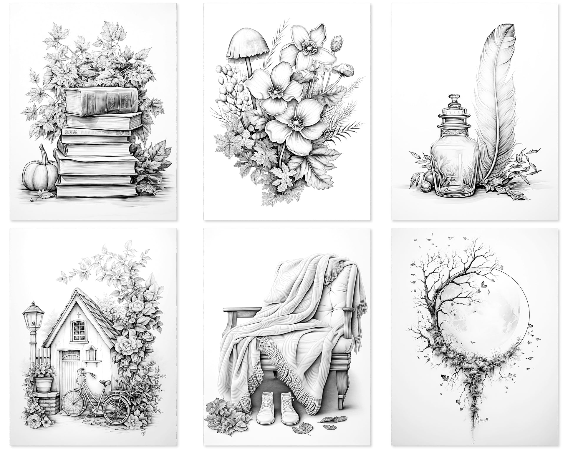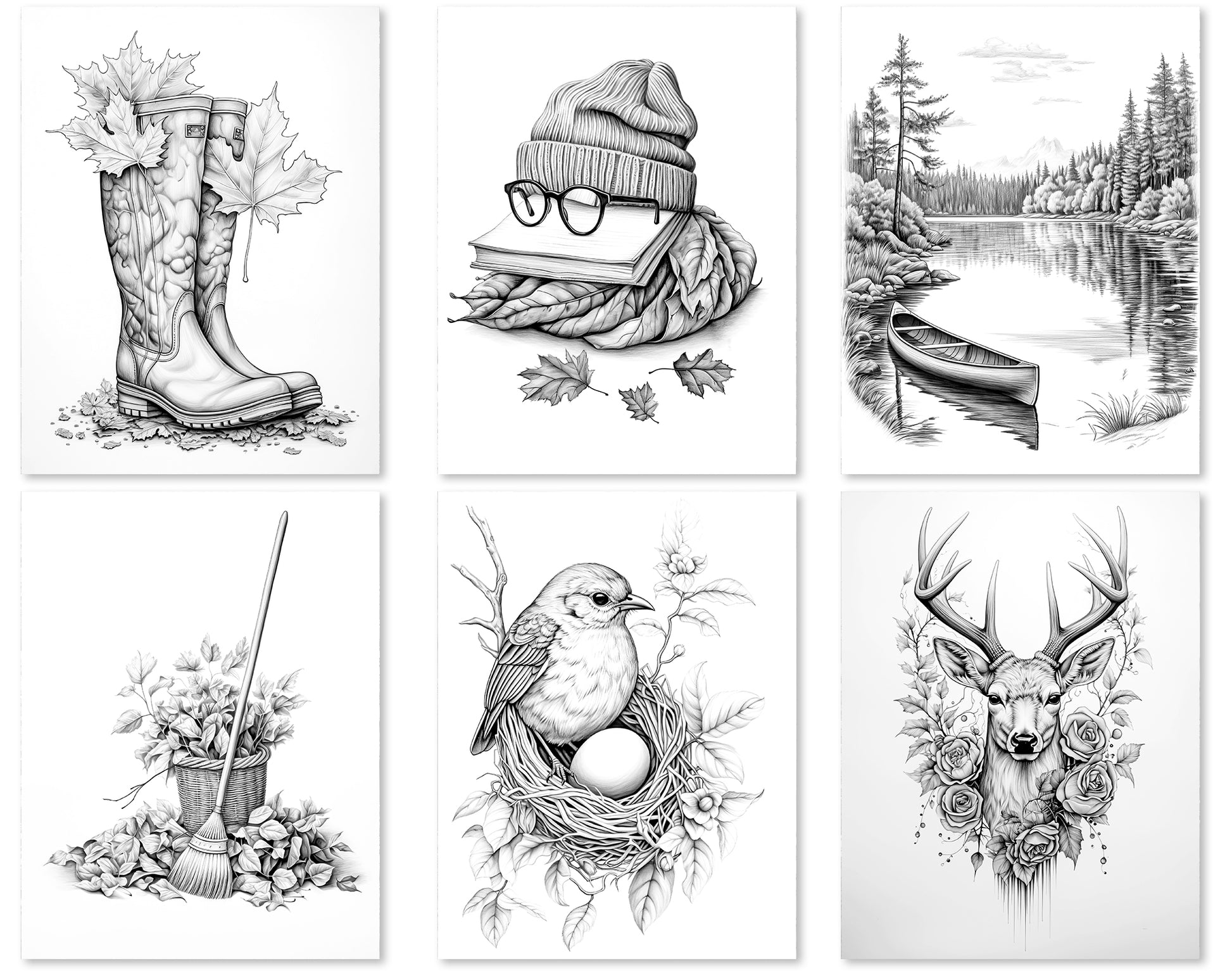 50 Minimalist Autumn Grayscale Coloring Pages - Instant Download - Printable PDF Dark/Light