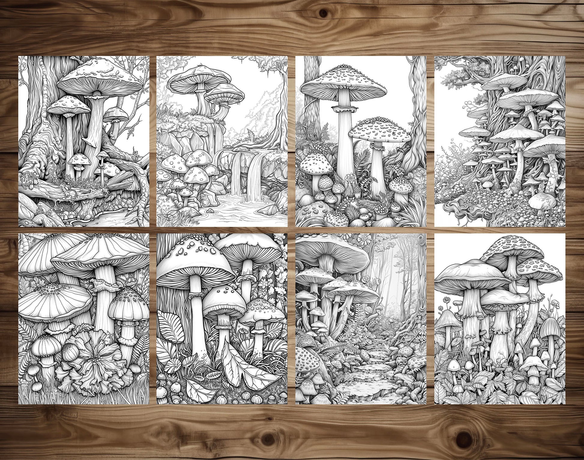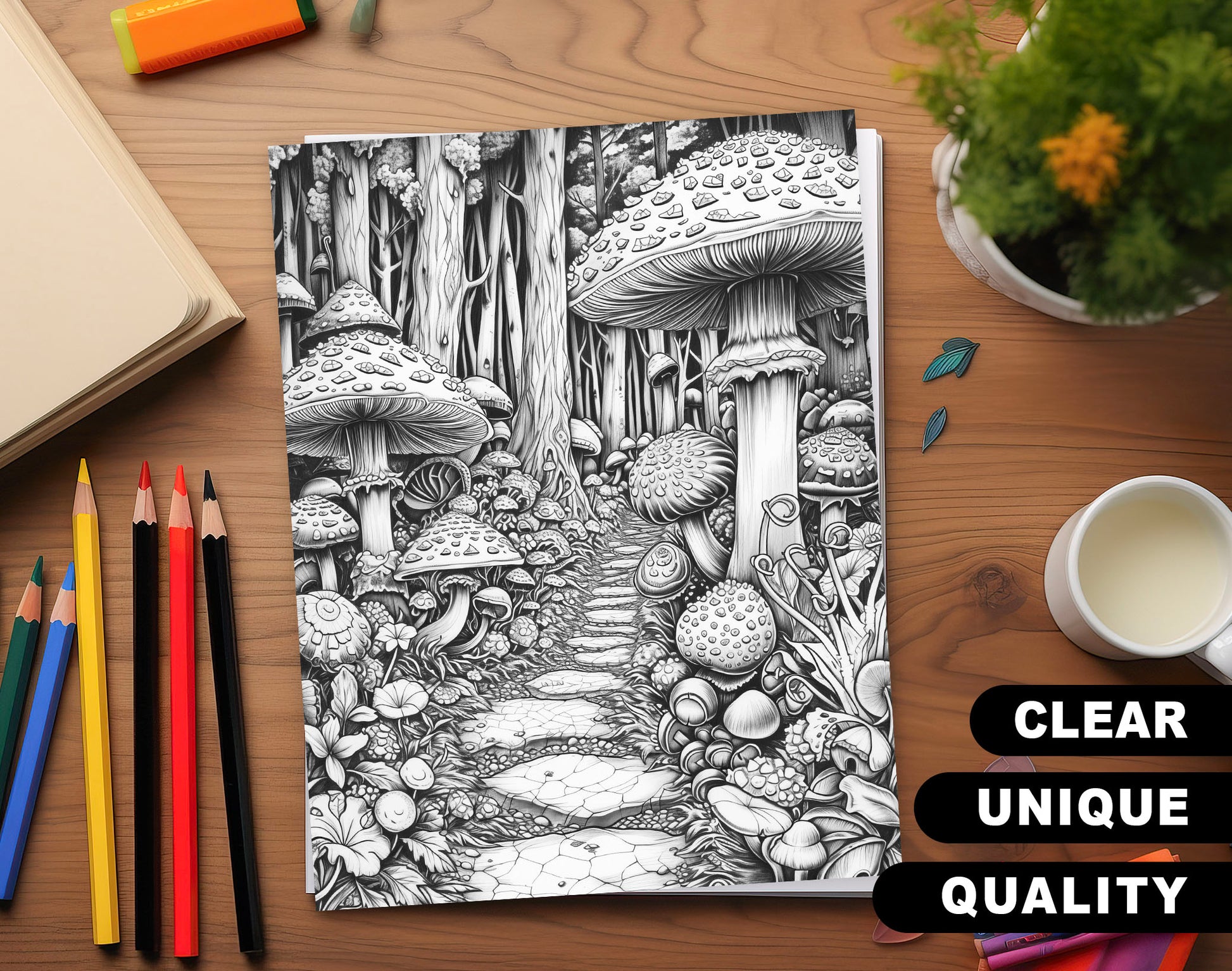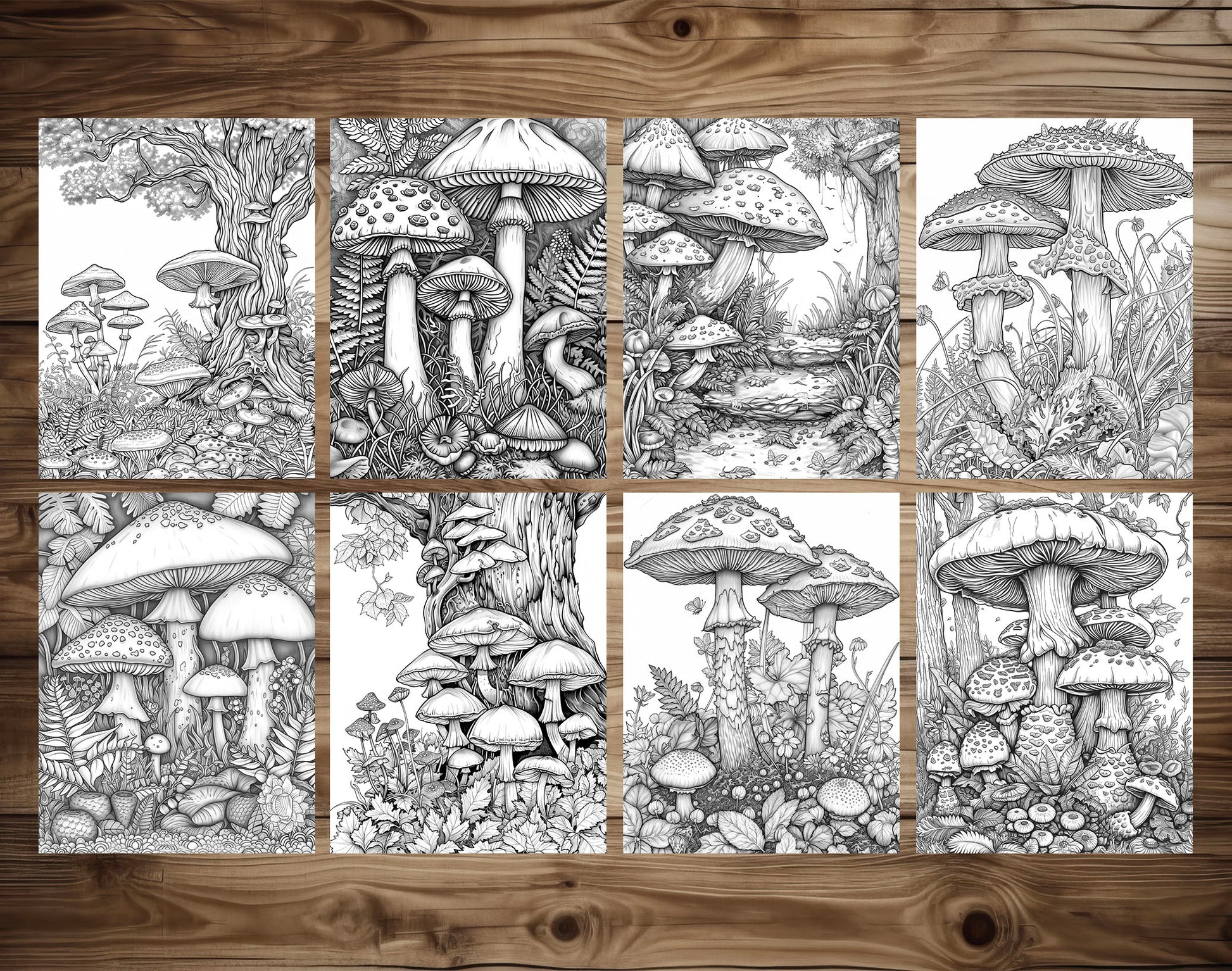 50 Mushroom Forest 2 Grayscale Coloring Pages - Instant Download - Printable PDF Dark/Light