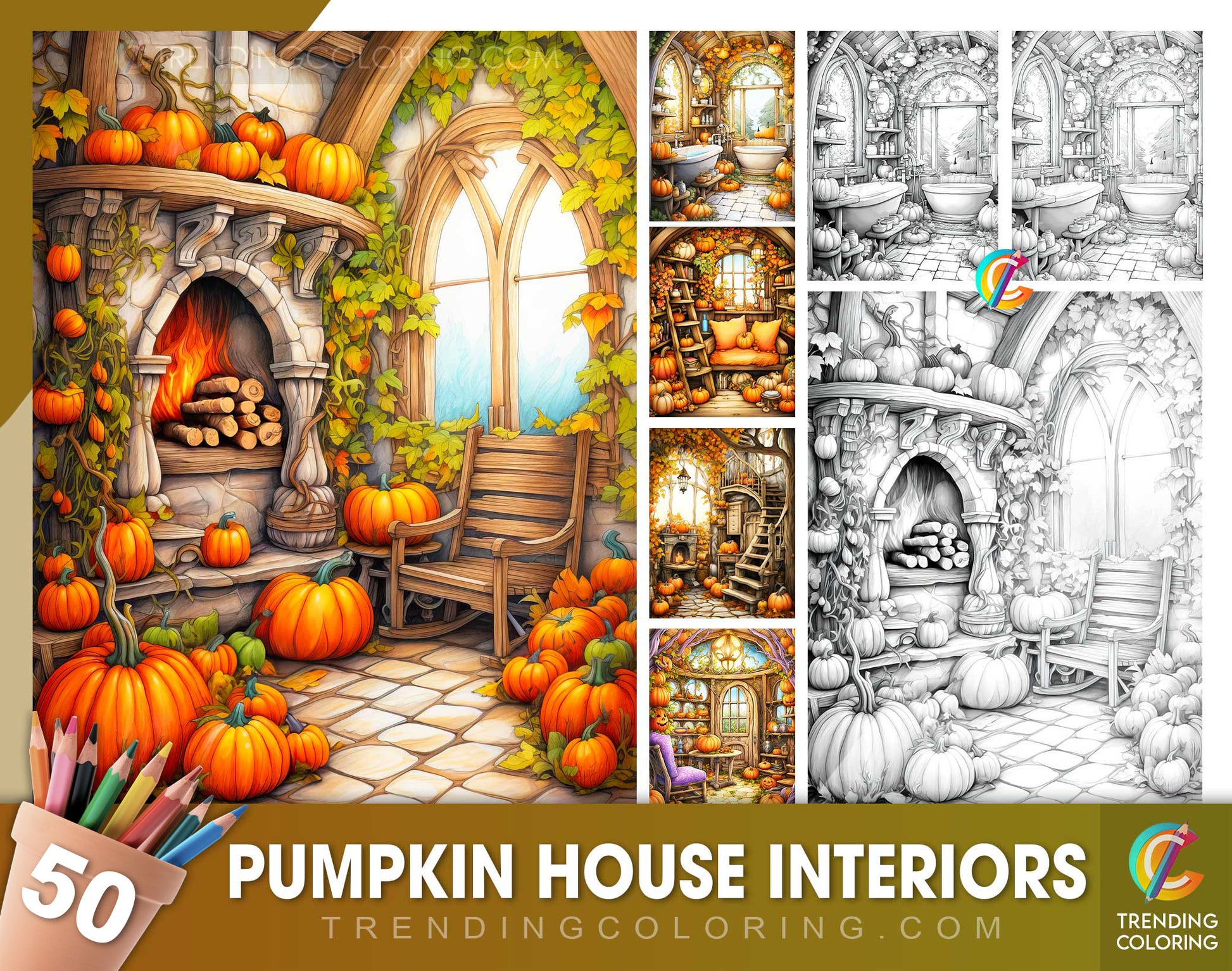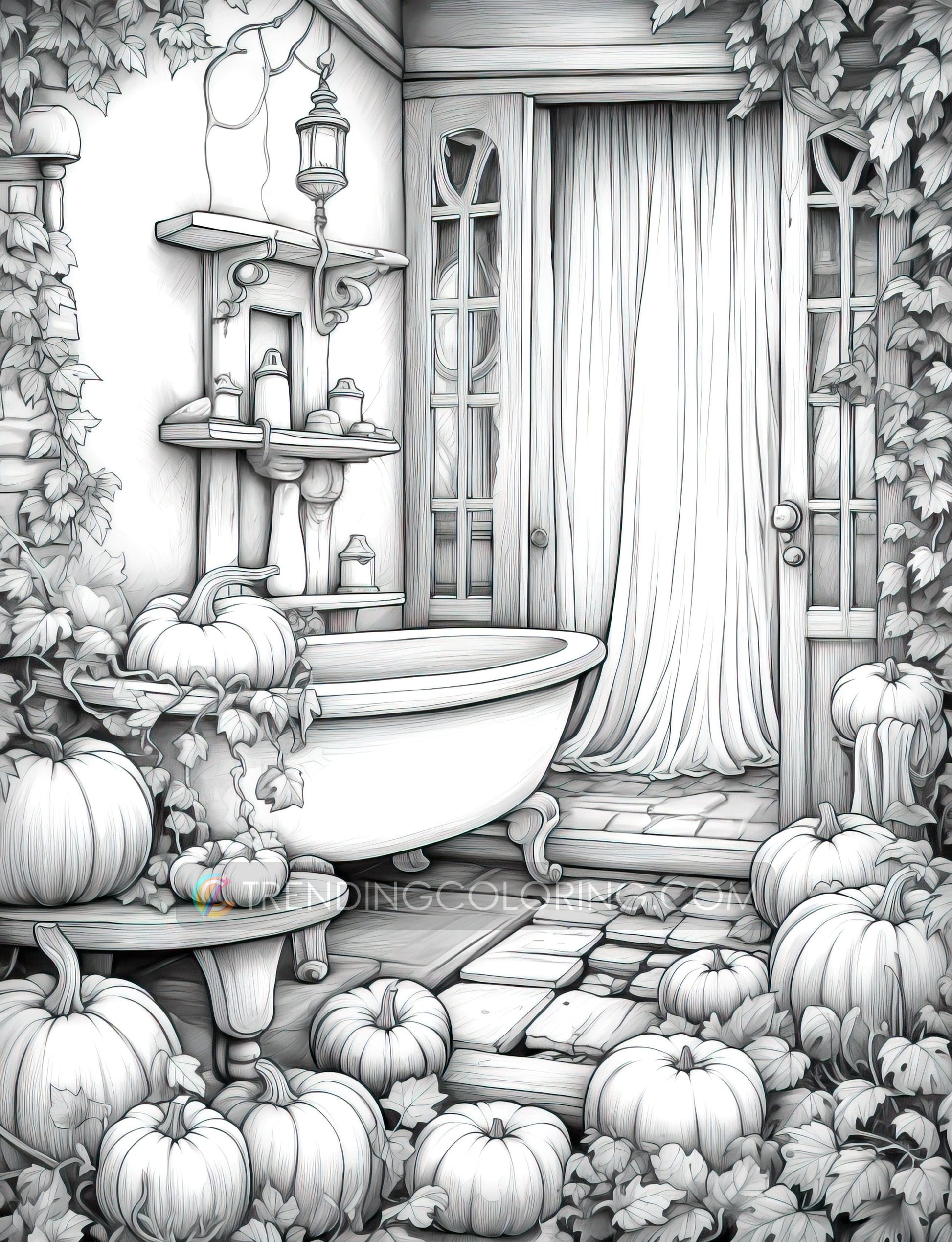 50 Pumpkin House Interiors Grayscale Coloring Pages - Halloween Coloring - Instant Download - Printable PDF Dark/Light