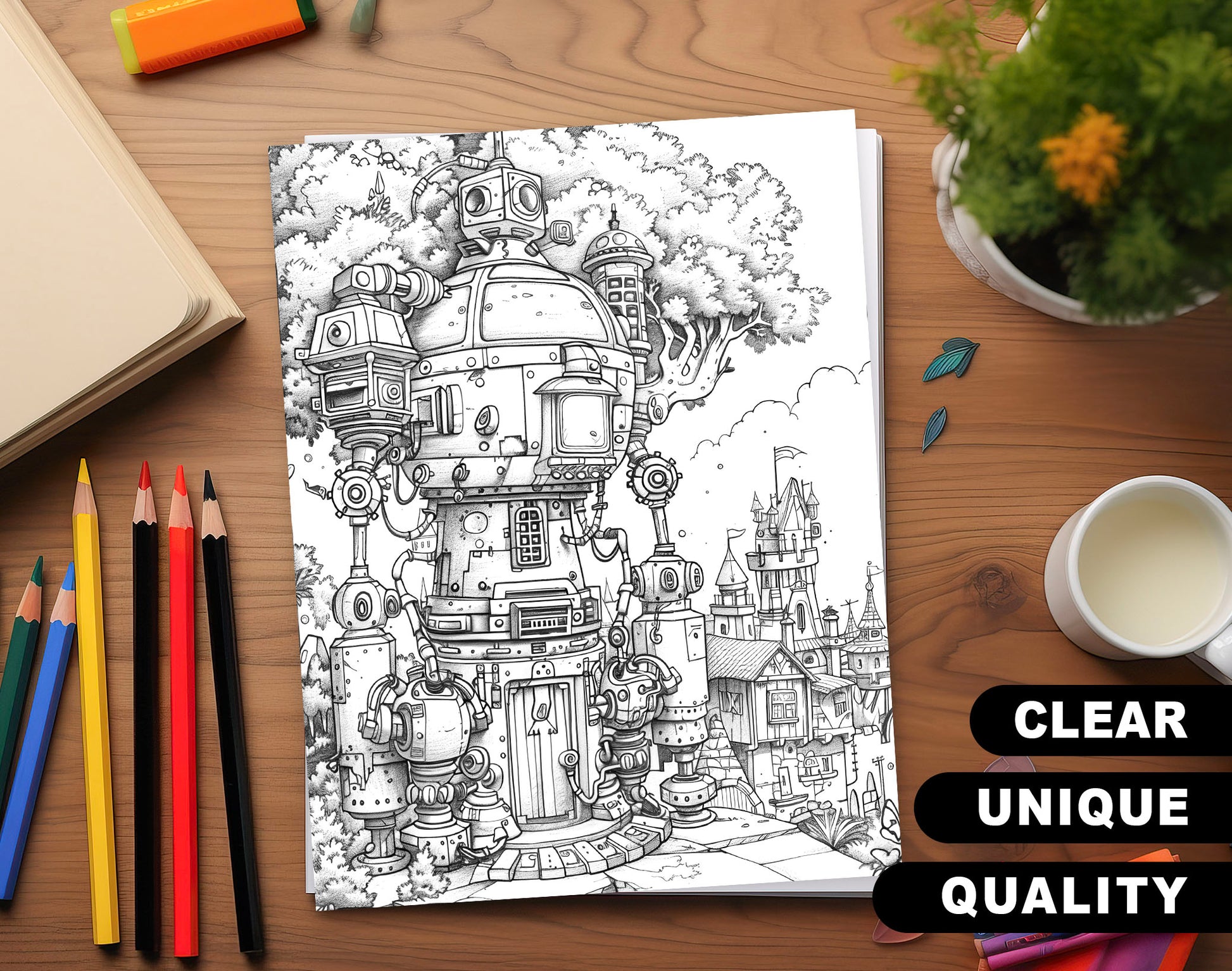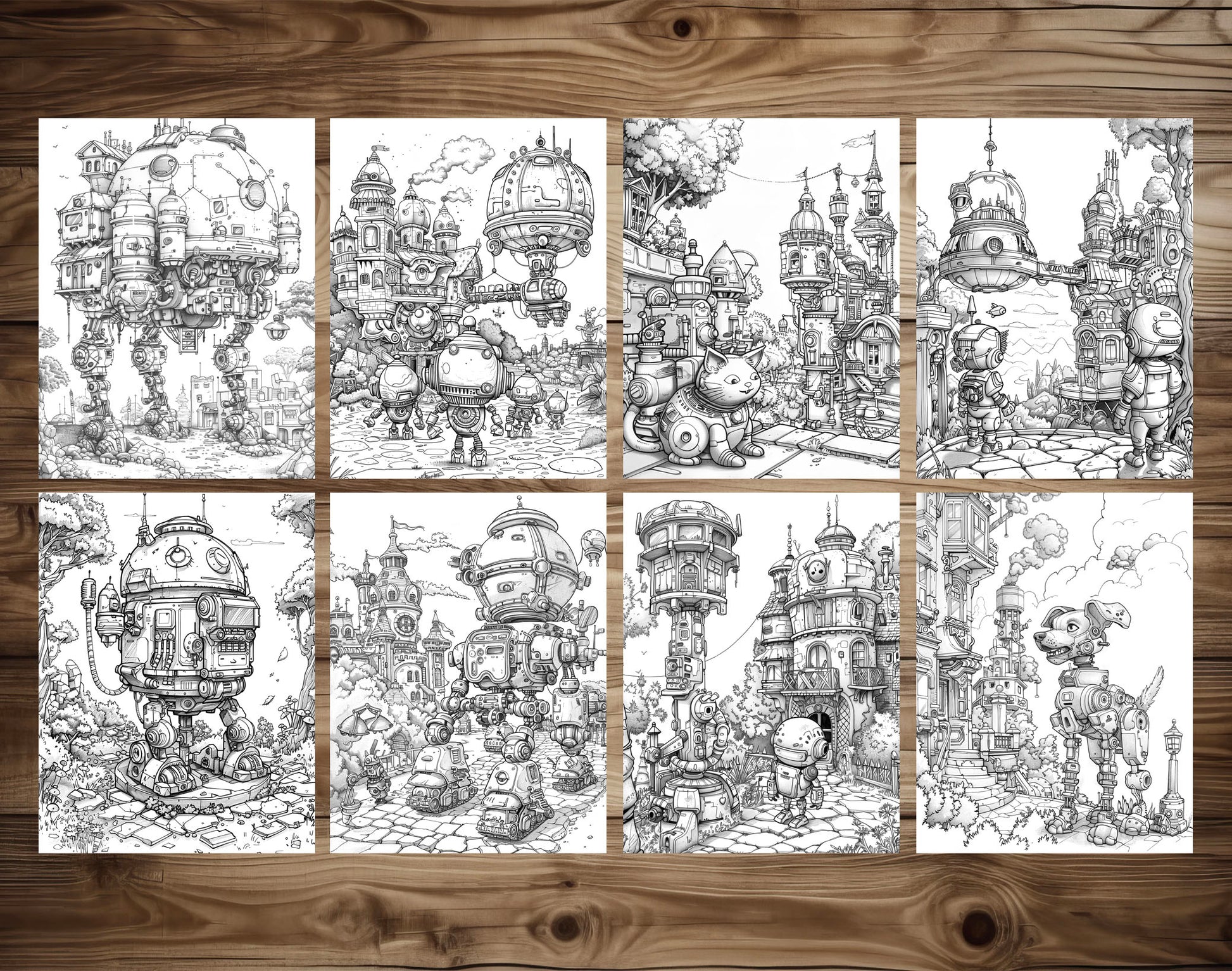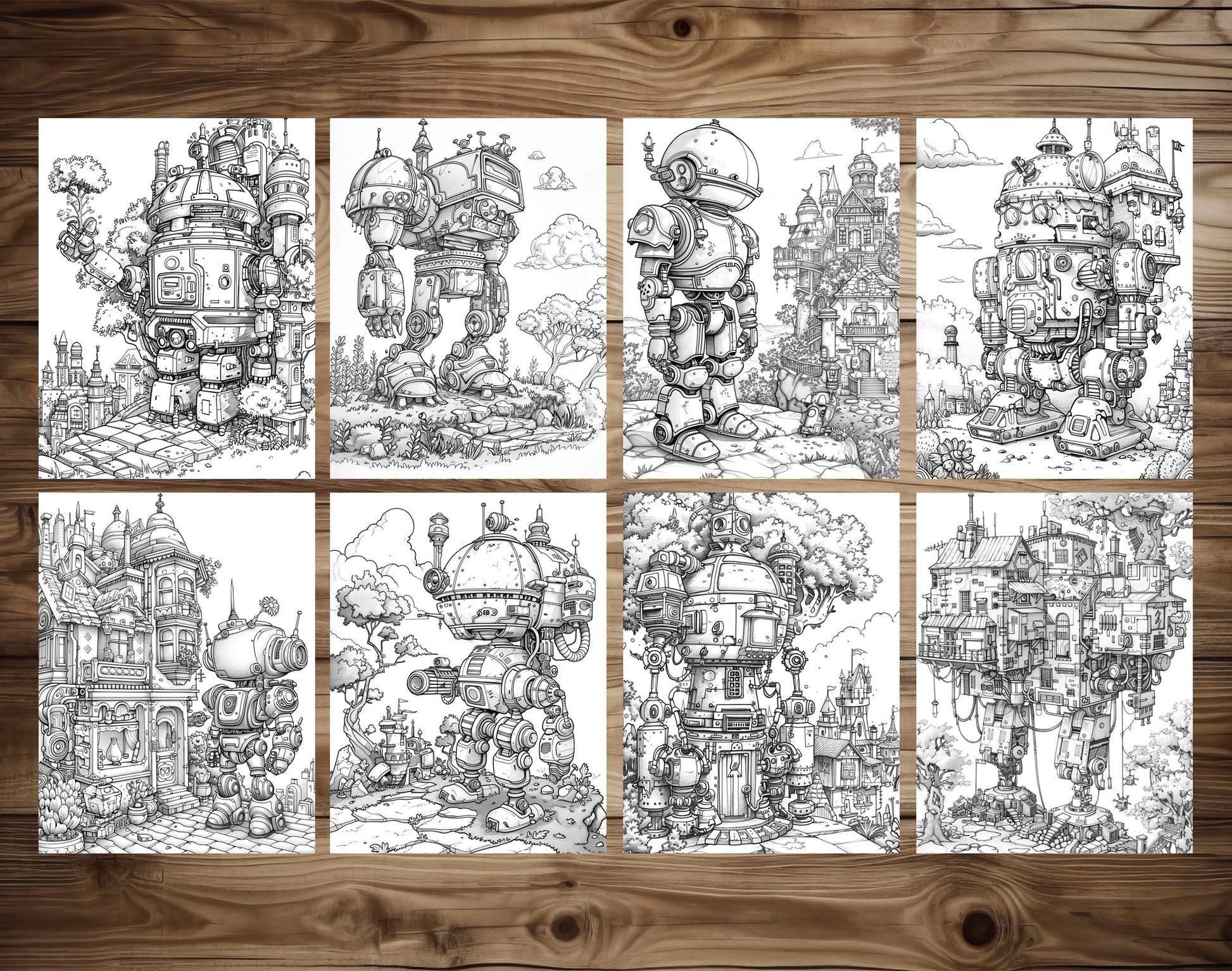 Power up your artistic engine and get ready to color a robot utopia with these sci-fi grayscale pages!